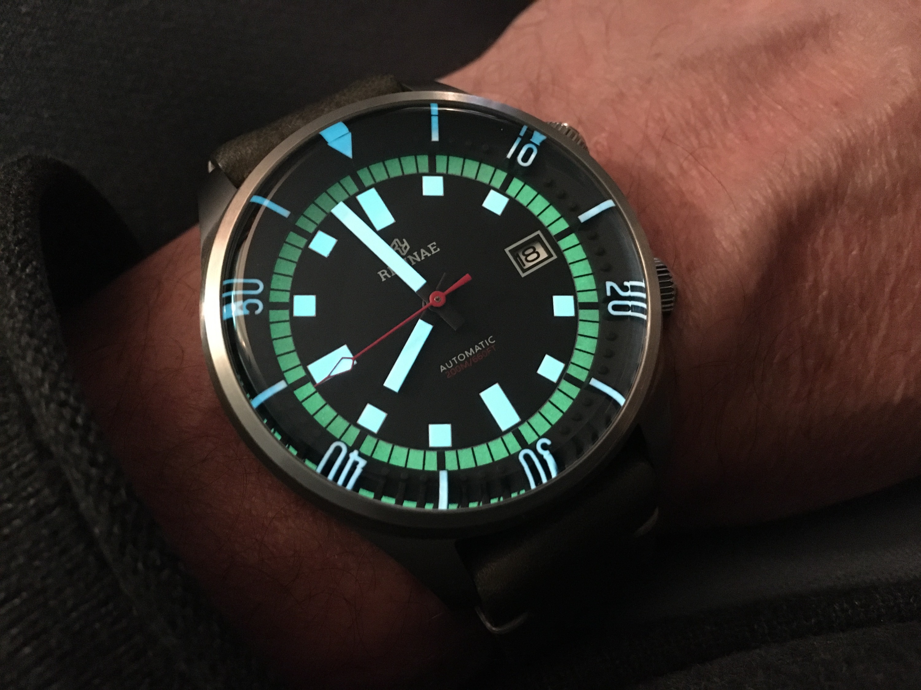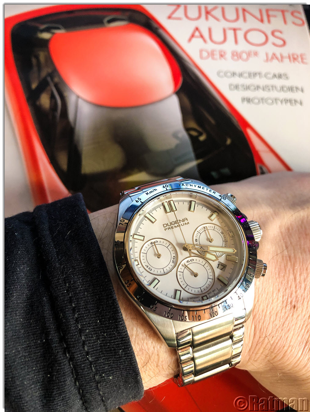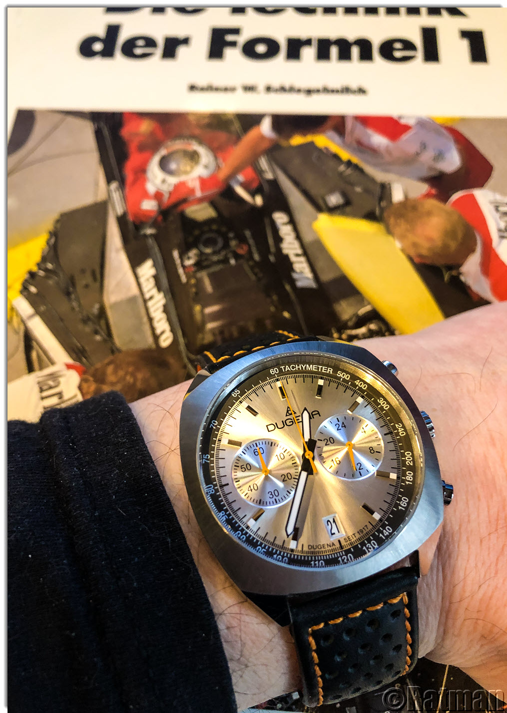 Ich hatte lange nach einer Kemora gesucht, sie ist aber neu nicht mehr erhältlich und wird gebraucht kaum angeboten. Und wenn, dann zu Mondpreisen. Hab nun eine von einem netten UF-Mitglied erwerben können. Das originale Leder-Band habe ich gegen ein Lorica Techleather Band getauscht, welches noch in meiner Bänderkiste schlummerte. Die orangefarbene Naht passt gut zum Sekundenzeiger bzw. zu den Zeigern auf den Totis, wie ich finde.