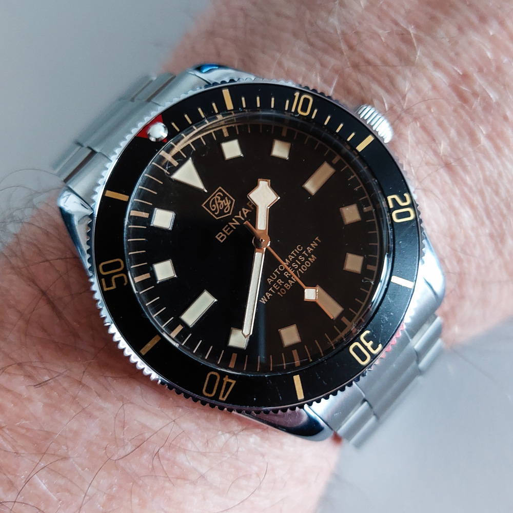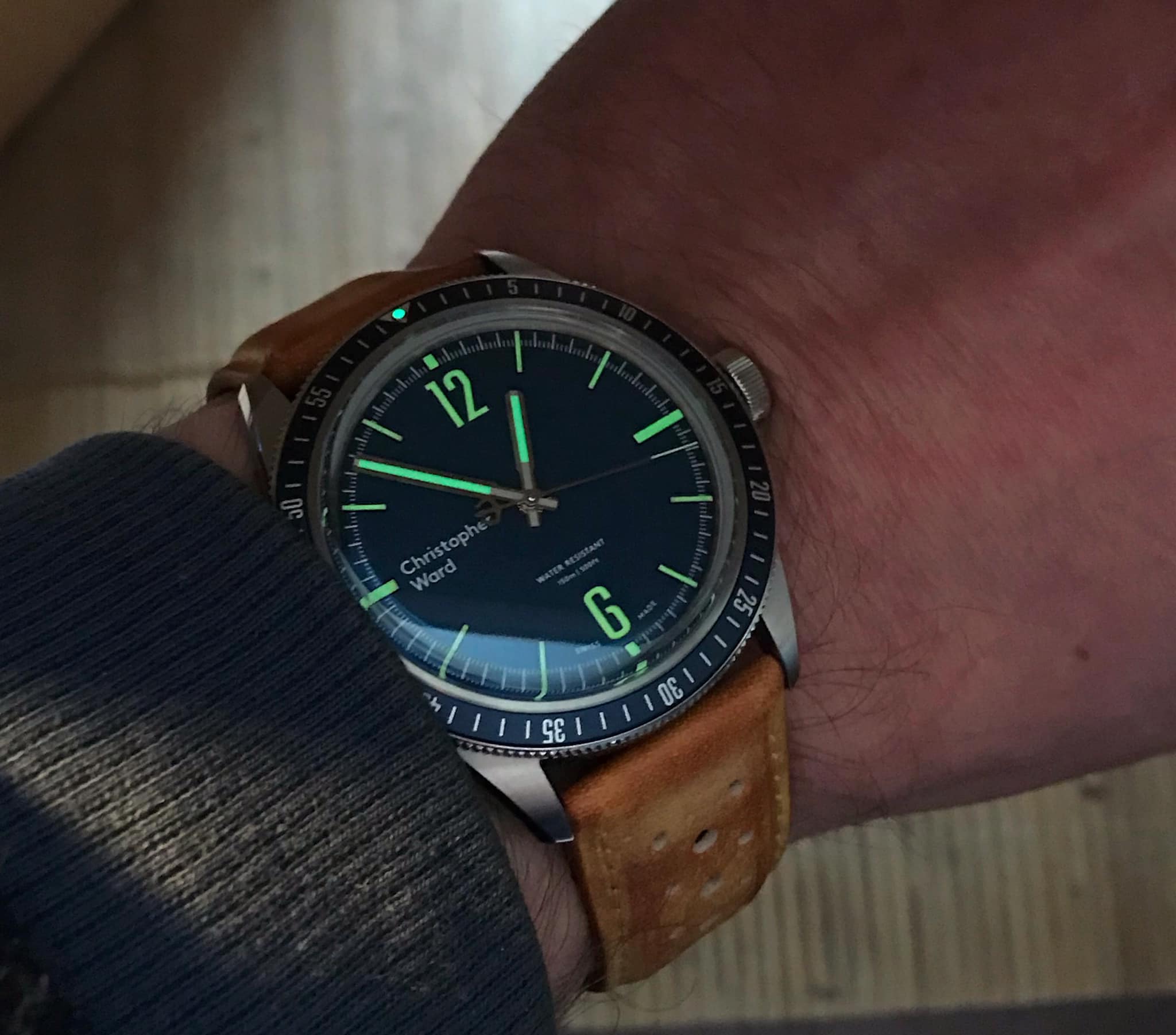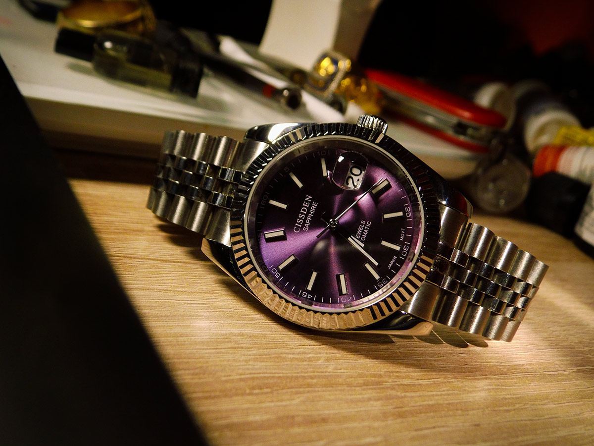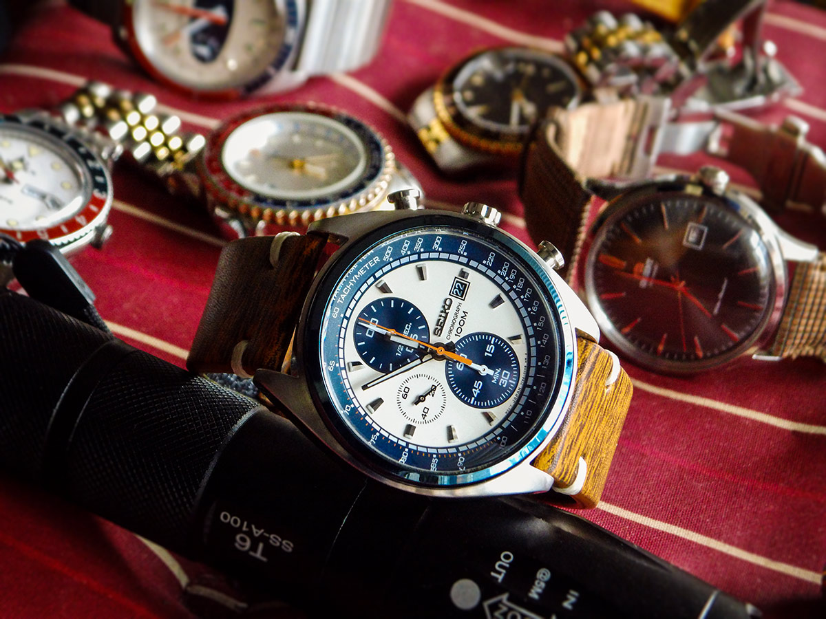 Ich hatte lange nach einer Kemora gesucht, sie ist aber neu nicht mehr erhältlich und wird gebraucht kaum angeboten. Und wenn, dann zu Mondpreisen. Hab nun eine von einem netten UF-Mitglied erwerben können. Das originale Leder-Band habe ich gegen ein Lorica Techleather Band getauscht, welches noch in meiner Bänderkiste schlummerte. Die orangefarbene Naht passt gut zum Sekundenzeiger bzw. zu den Zeigern auf den Totis, wie ich finde.