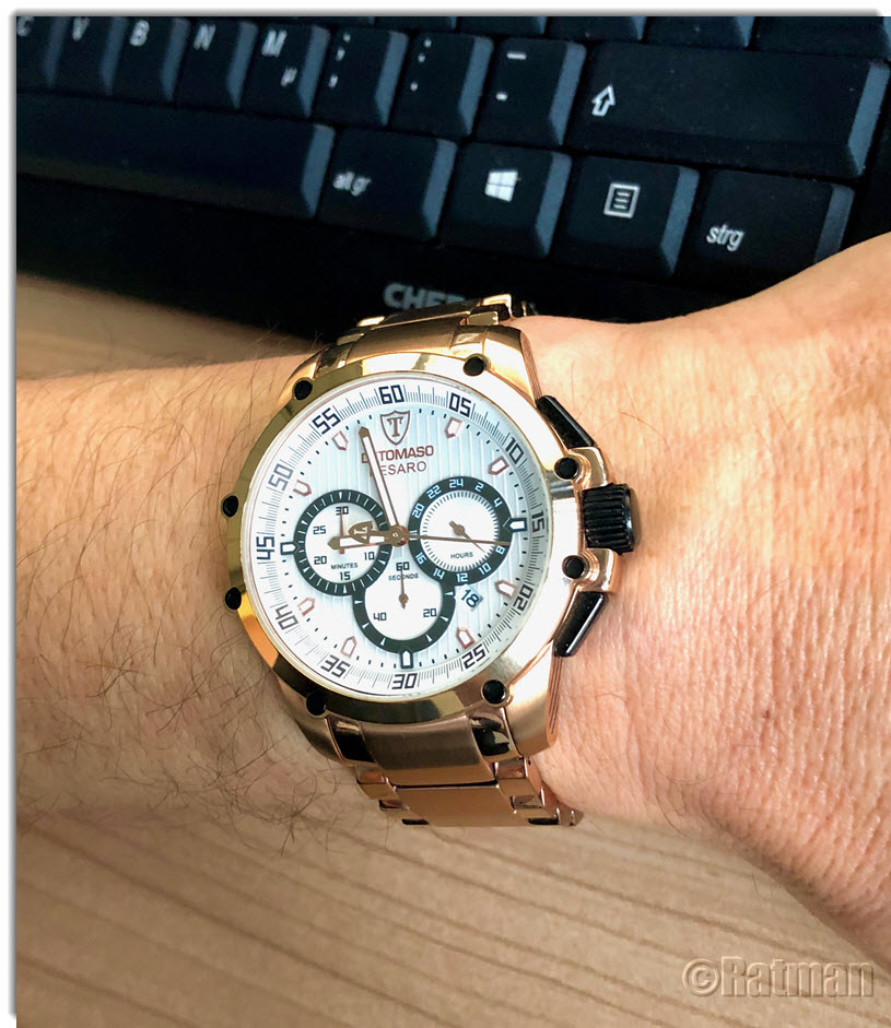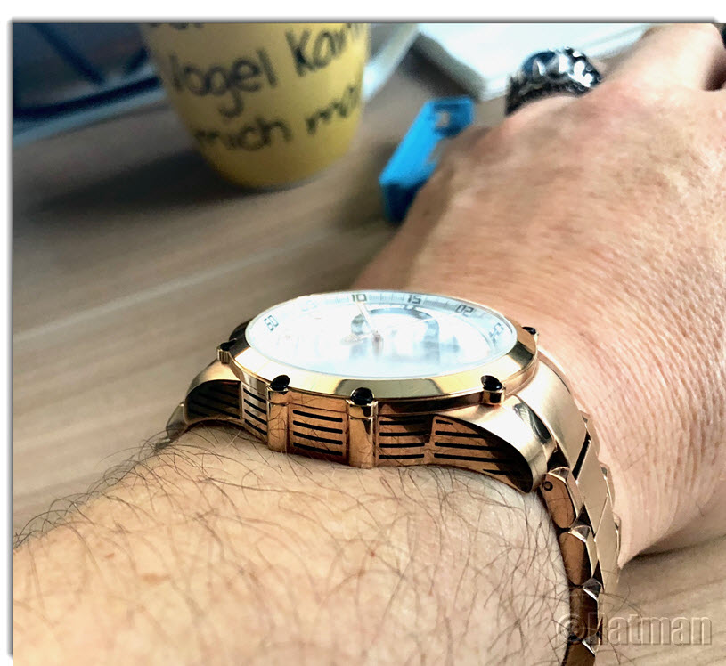 Heute ein weiterer Neuzugang: DeTomaso PESARO. Die Farbe ist schwer einzufangen oder zu beschreiben. Im Tageslicht eher Kupfer (so auch die offizielle Bezeichnung des Herstellers), doch meist wirkt es eher wie eine Mischung aus Kupfer und Roségold. Momentan gefällt sie mir sehr gut, jedoch bin ich nicht sicher, ob ich nicht das Armband gegen eines aus Kunstleder oder Stoff tausche, damit es nicht zu viel BlingBling ist.