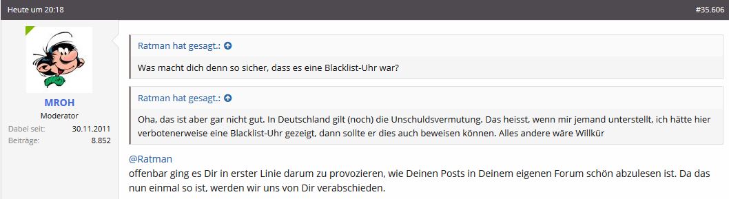 Du wurdest aus folgendem Grund gebannt: Macht das UF in einem anderen Forum schlecht und unterläuft absichtlich die Blacklist, indem die Fotodatei der Parnis Uhr manipuliert wurde..