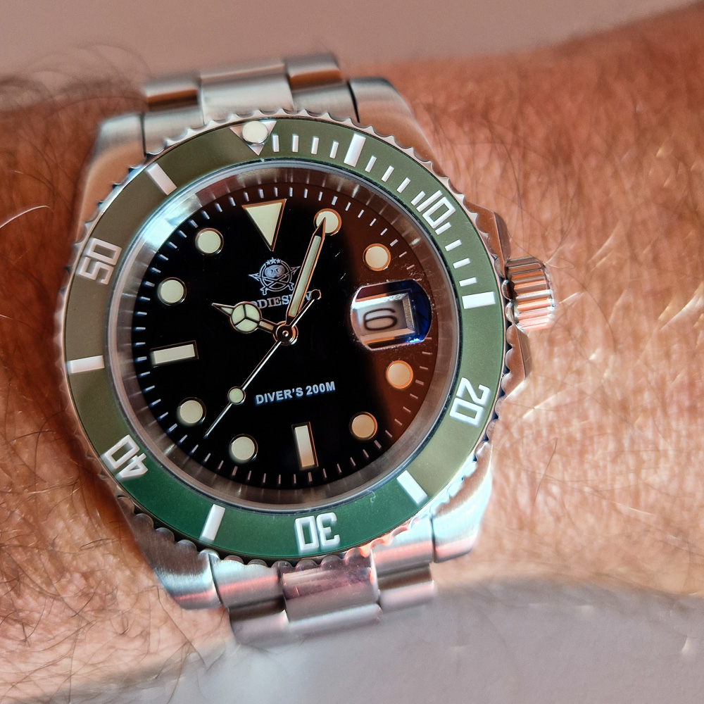 Am Wochenende ebenfalls eingetroffen und ein Lichtblick nach der Enttäuschung mit der "Paganomat": PAGANI PD-1706 aka BB58 Hommage. Gibt nichts zu meckern für den Preis, ich hätte mir lediglich die Lünetteneinlage etwas matter gewünscht (und ein bissel besser zentriert). Lünette mit 90 Klicks? Hm, wofür man das wohl benötigt...