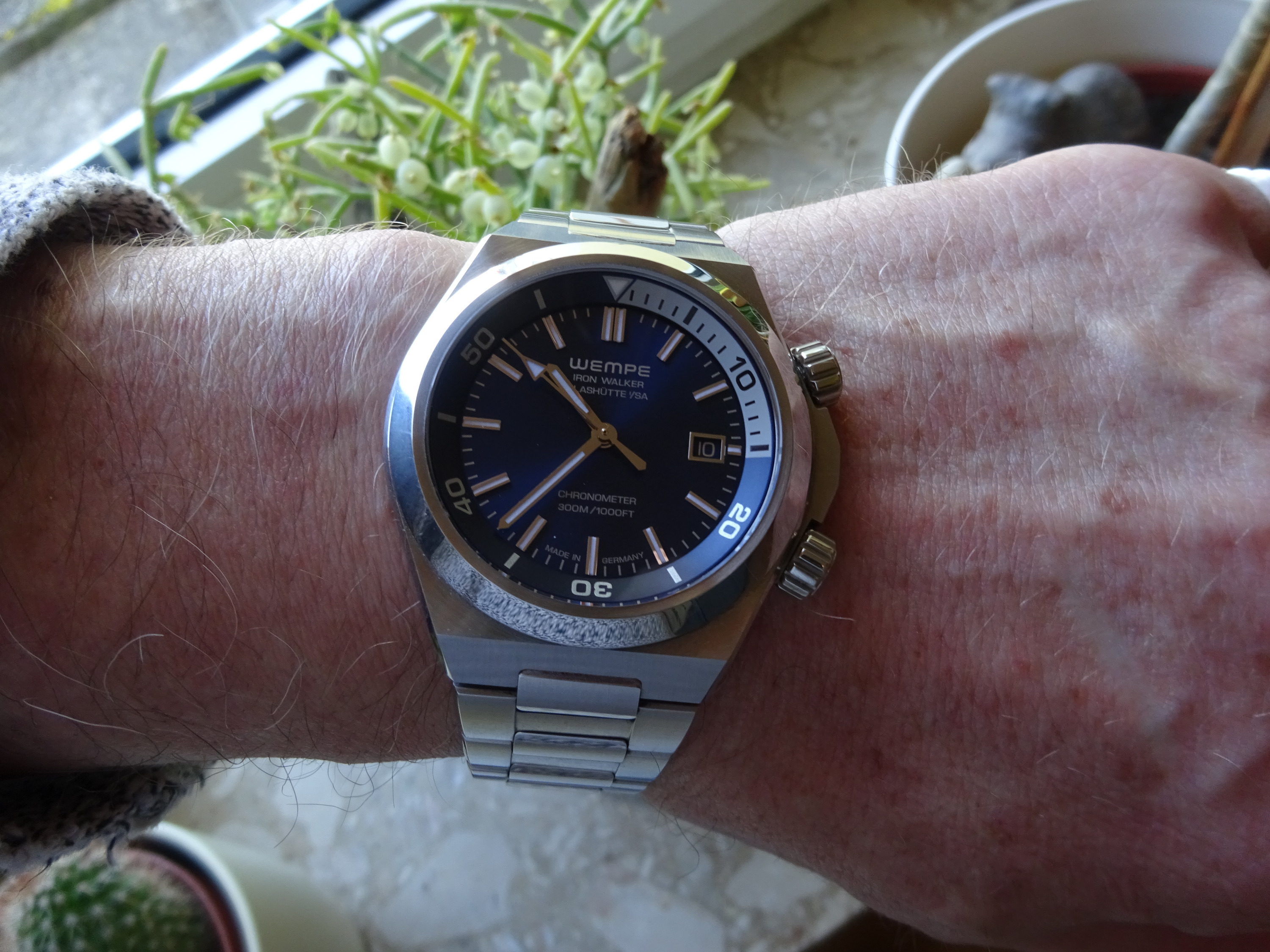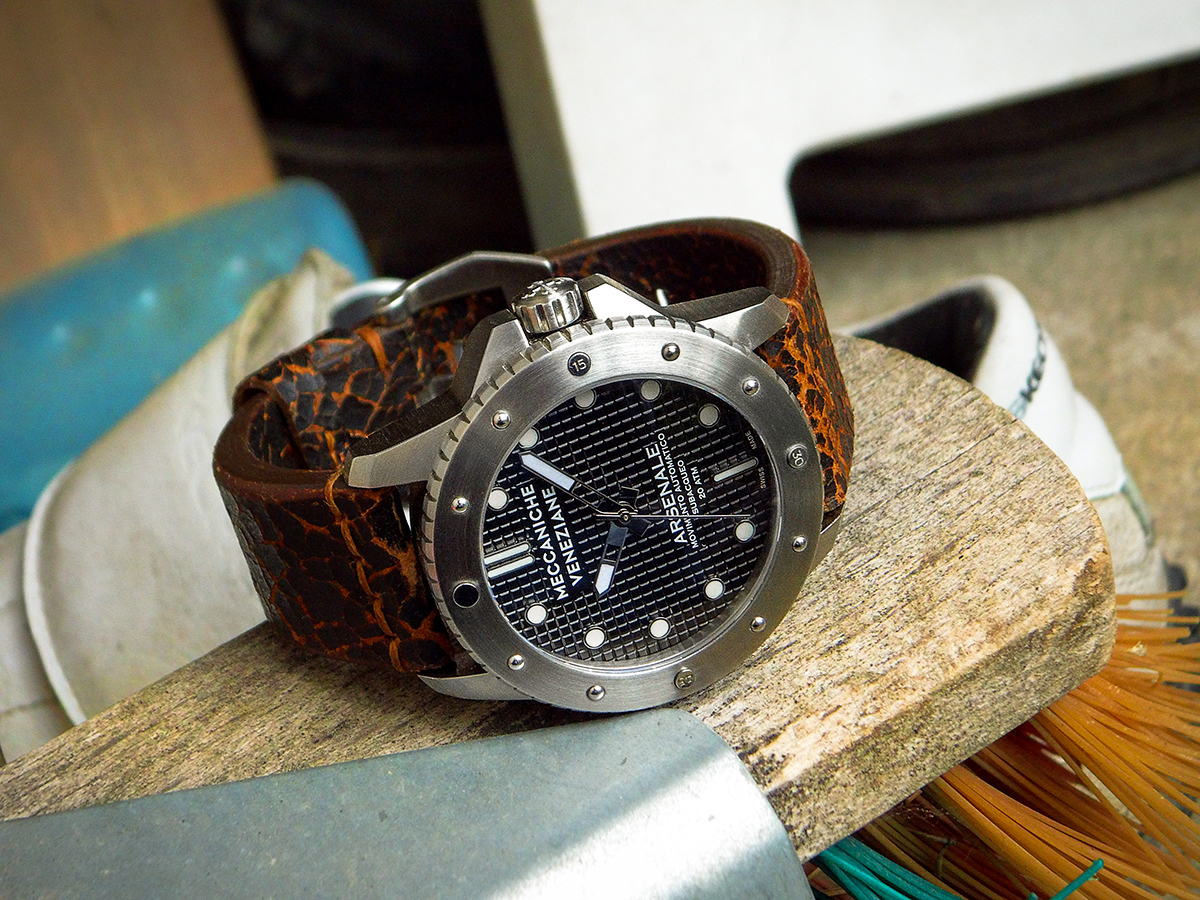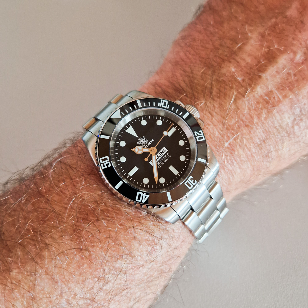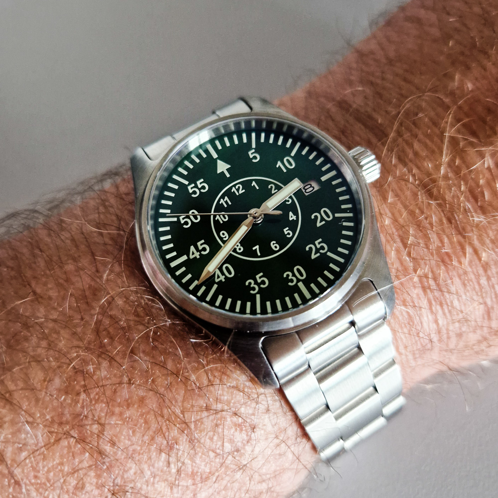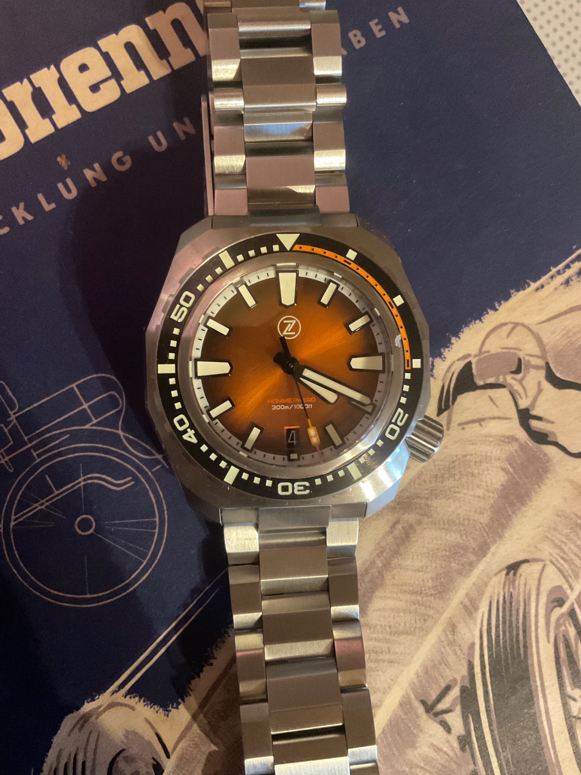 Hier die Zelos Hammerhead, 44mm, NH35, schon ein sehr wuchtiger und kantiger „Brummer“.