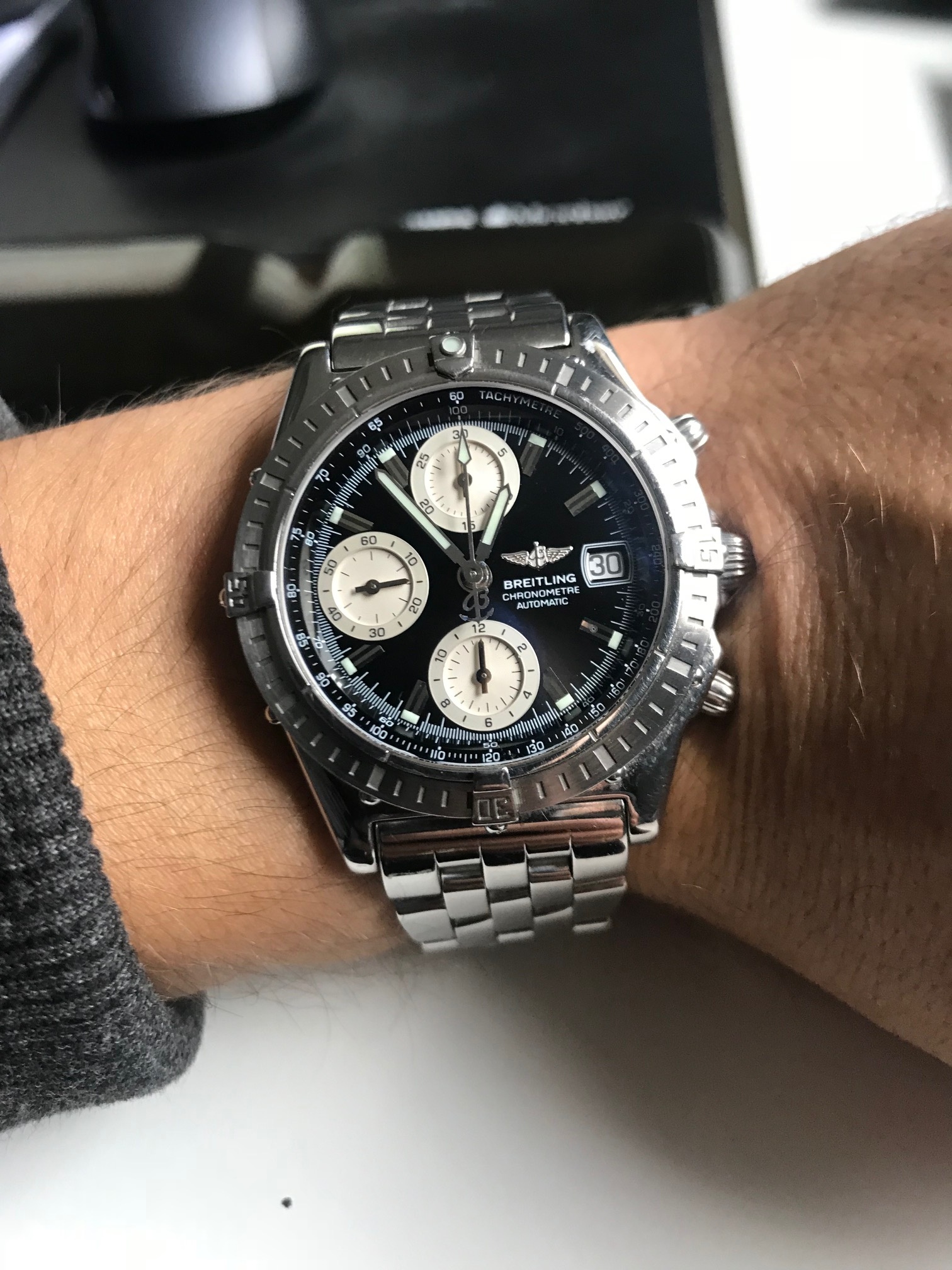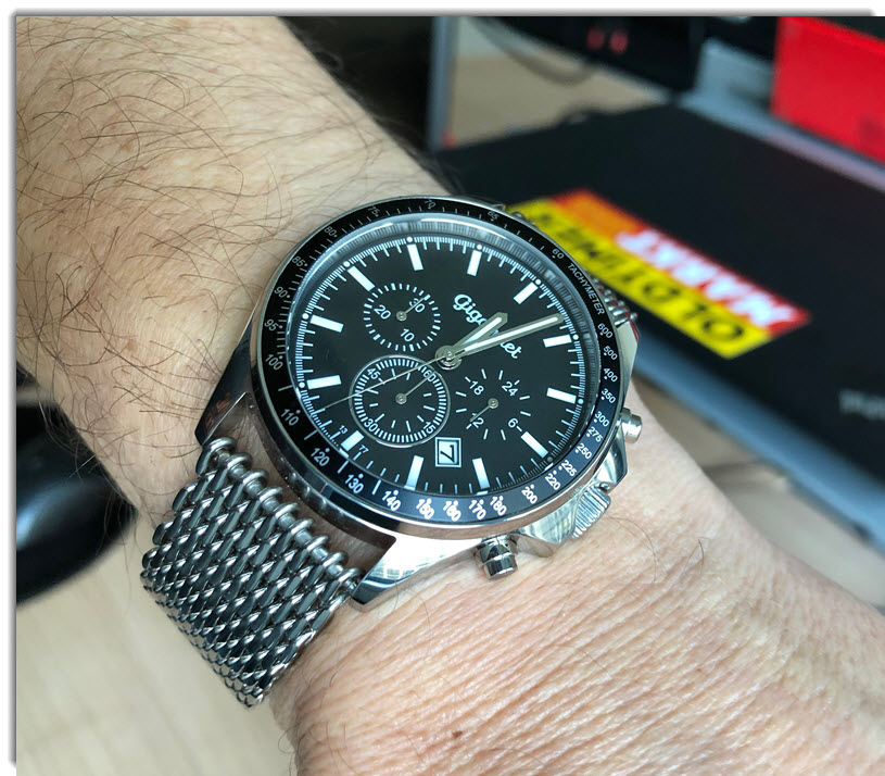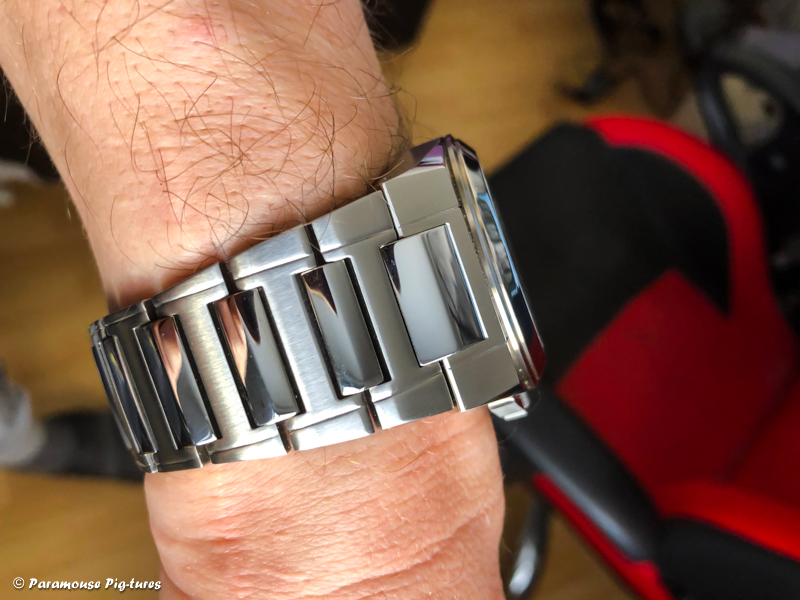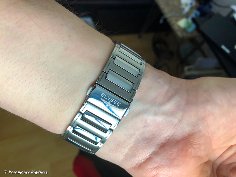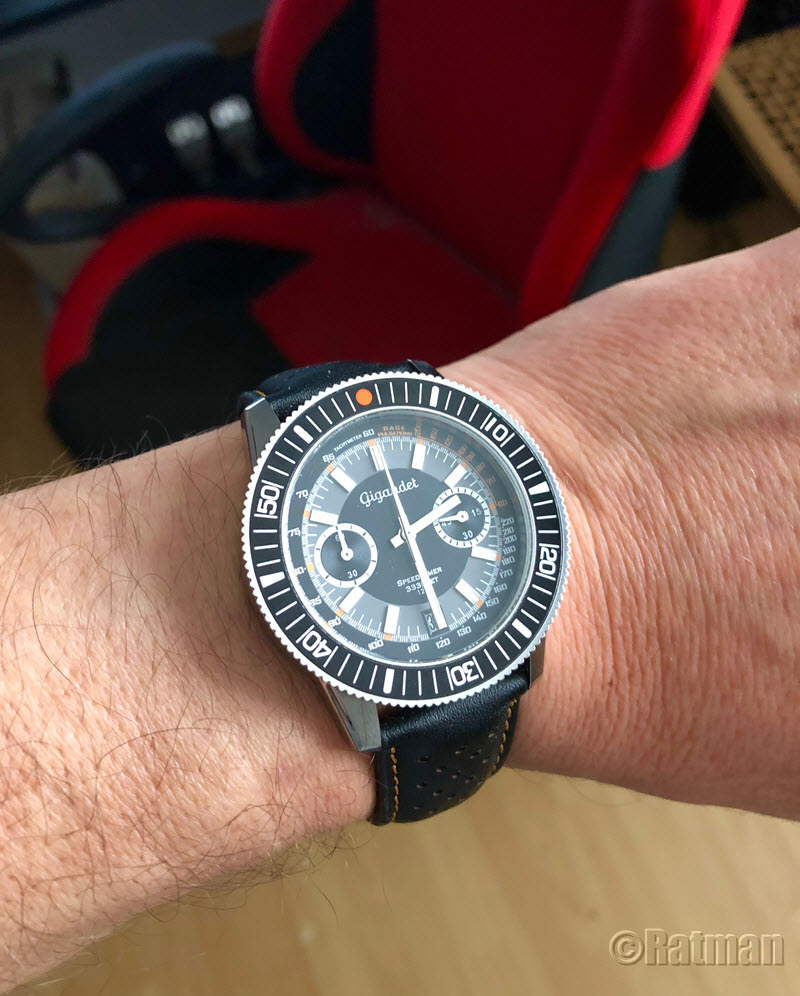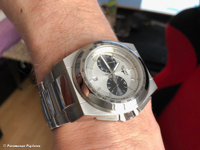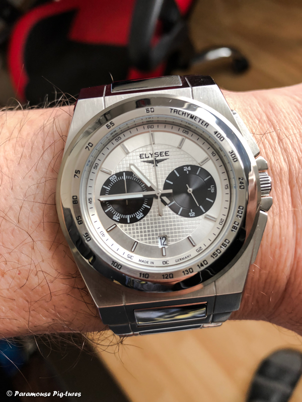 12 Nov. 2018 12:24Ich trage heut meine Neuerwerbung, eine Elysee 44001 "Pole Position". Eine recht außergewöhnliche Uhr, wie ich finde. Durch das integrierte Armband erhält sie mit einem Hauch von Genta. Das Teil wirkt auch deutlich wuchtiger als die reinen Maße vermuten lassen. Die Lünette misst 43 mm im Durchmesser, das Case mit Krone 46,4 mm. Und endlich mal wieder eine Uhr mit zentraler Stoppsekunde