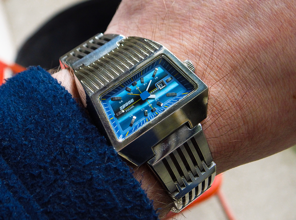Abgefahrenen Design! Mir gefällt sie, die Pulsar Spoon, auch das Band (bin ja Metallbandfreak, sogar an goldene Uhren kommt bei mir ein goldenes Band). Nur halt wohl leider Quarz. Von UMF Ruhla gab's ein ähnliches Design mit so schmalem querem Fensterchen, im sogenannten TV-Gehäuse, das eigentlich für eine Scheibenuhr gedacht war. Als sich die nicht mehr so gut verkauften, wurde eine Dreizeiger mit Datum da reingebaut. Ich hätte ja ein Foto, aber bin nur mit Handy. Und das tu ich mir nicht mehr an, damit was einzufügen.
