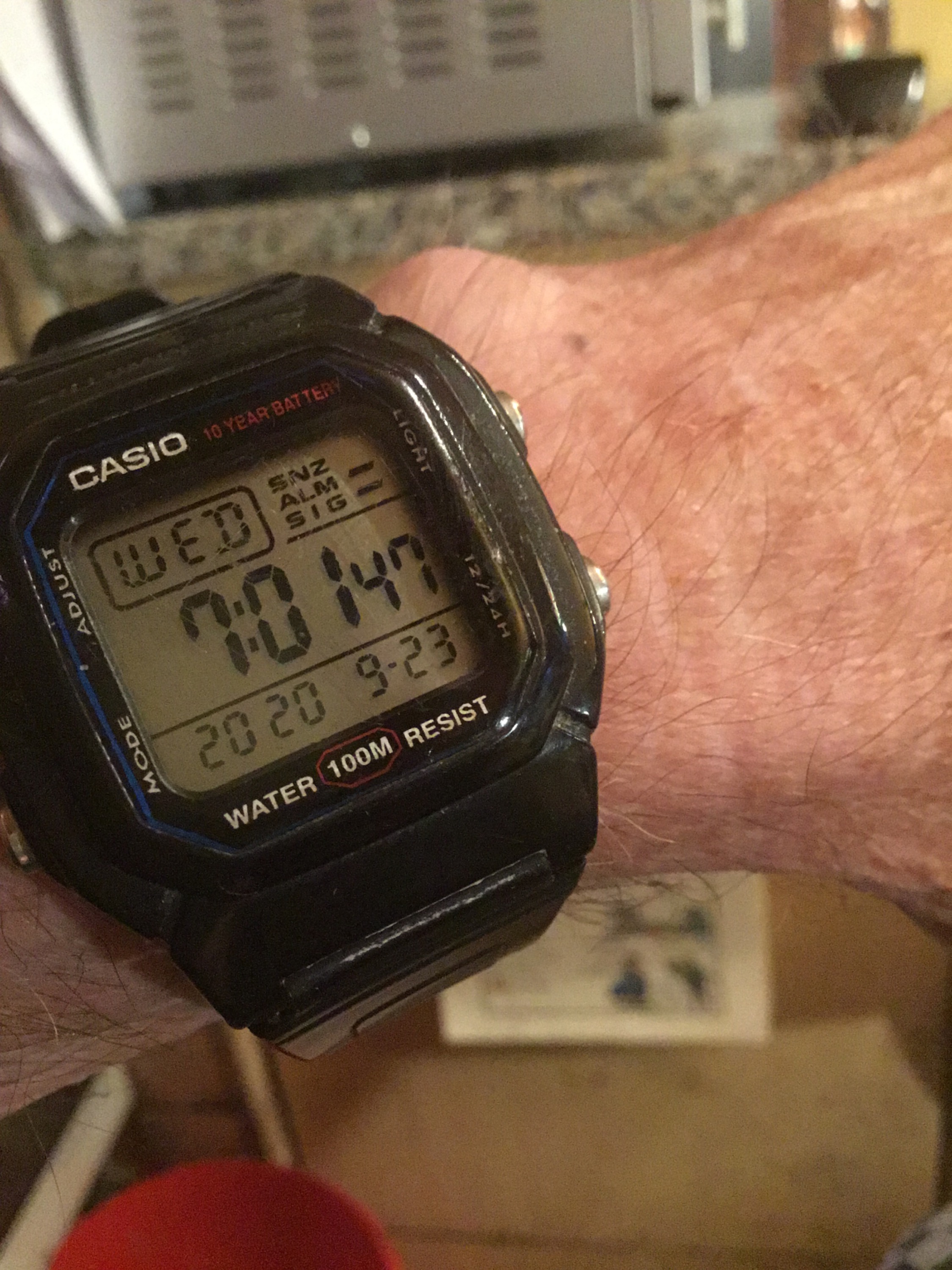 Und hier meine Uhr für alles, Schwimmbad, Sauna, Straßenwalze, Straßenbahn, Sturz aus 12. Etage, alles steckt sie mit links weg! Neue Batterien? Brauche ich nicht! Ich glaube, so robust wie diese Uhr, die Casio, da findet sich keine mehr so schnell!