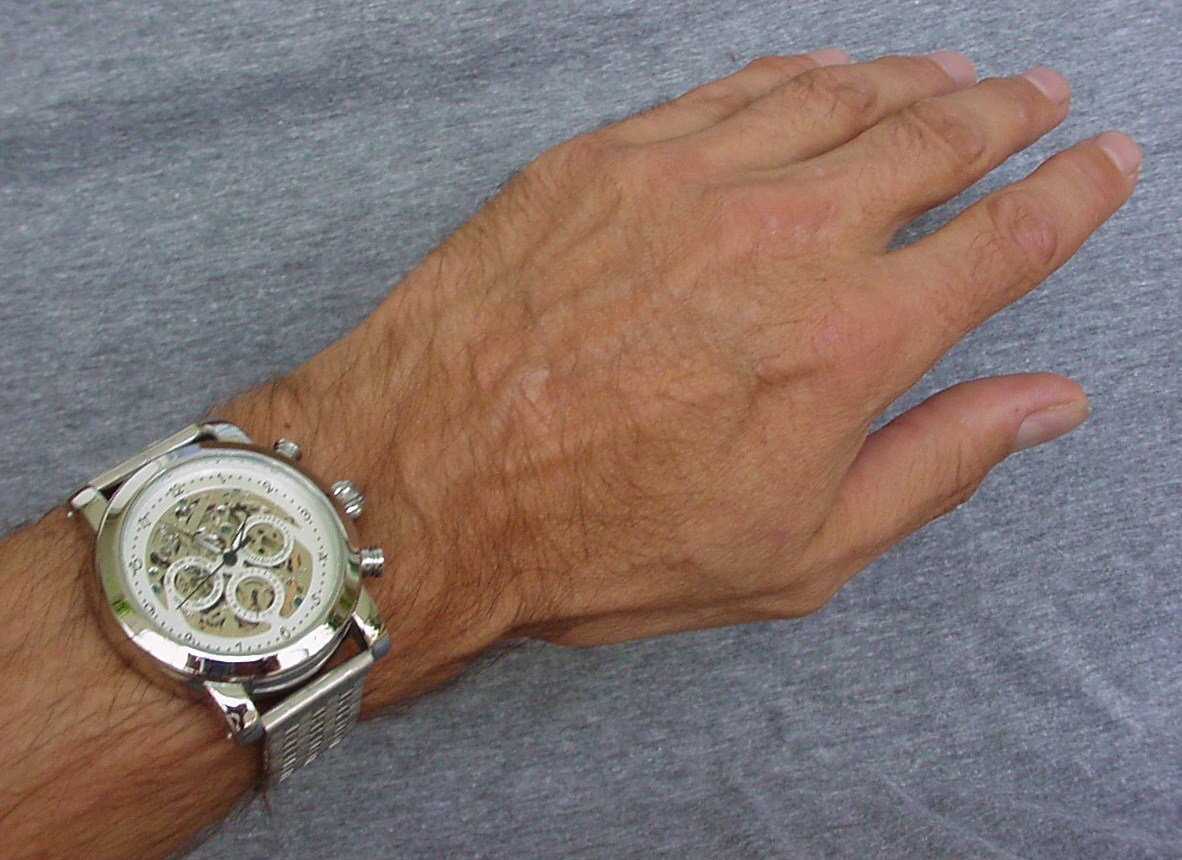 Wie man sieht ist es eine China-Uhr nach Bauart der berüchtigten Scheinchronographen. Es ist kein Chrono, sondern eine Kalenderuhr und die Totalisatoren zeigen Datum, Wochentag und eine 24-h-Anzeige an.