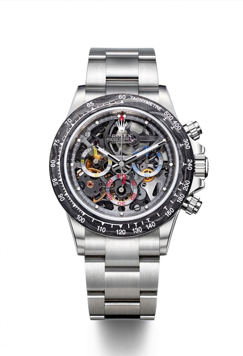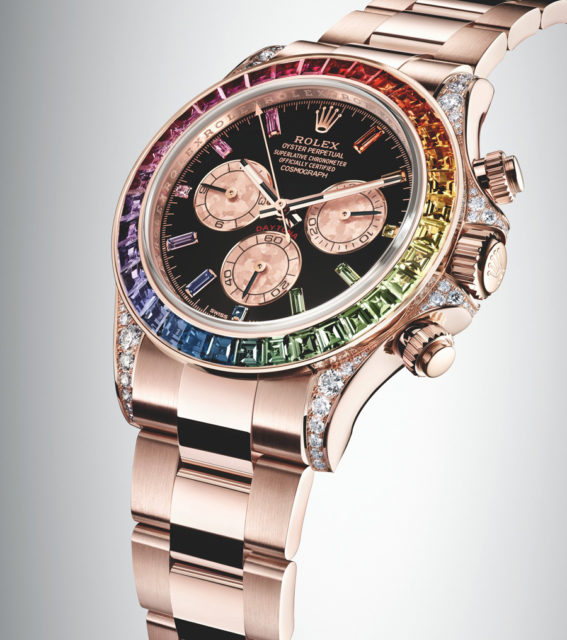 A propos Rolex: Meiner bescheidenen Meinung nach sind die gerade dabei, den Ruf der Daytona zu ruinieren. Anstatt mal auf die Fans zu hören und eine neue Daytona in zeitgemäßer Größe rauszubringen, bringt man lieber Neuheiten von erlesener Scheußlichkeit auf den Markt. Wie beispielsweise folgendes Modell, welches auf den schönen Namen "Rolex Oyster Perpetual Cosmograph Daytona Everose Gold Saphire Rainbow" hört: