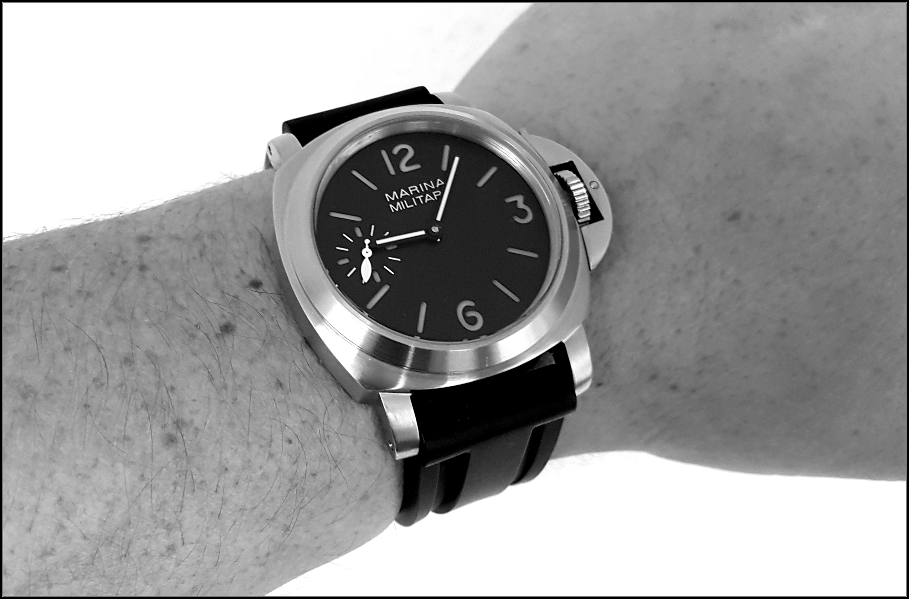 Das werkseitige, durchaus schicke braune Lederarmband mit Dornschließe habe ich sofort durch ein schwarzes Teju-Armband mit nobel wirkender Butterfly-Faltschließe ersetzt, da ich einerseits keine Dornschließenarmbänder mag und zudem gerne die Farbe des Uhrenarmbandes Ton in Ton an das Zifferblatt der Uhr anpasse.