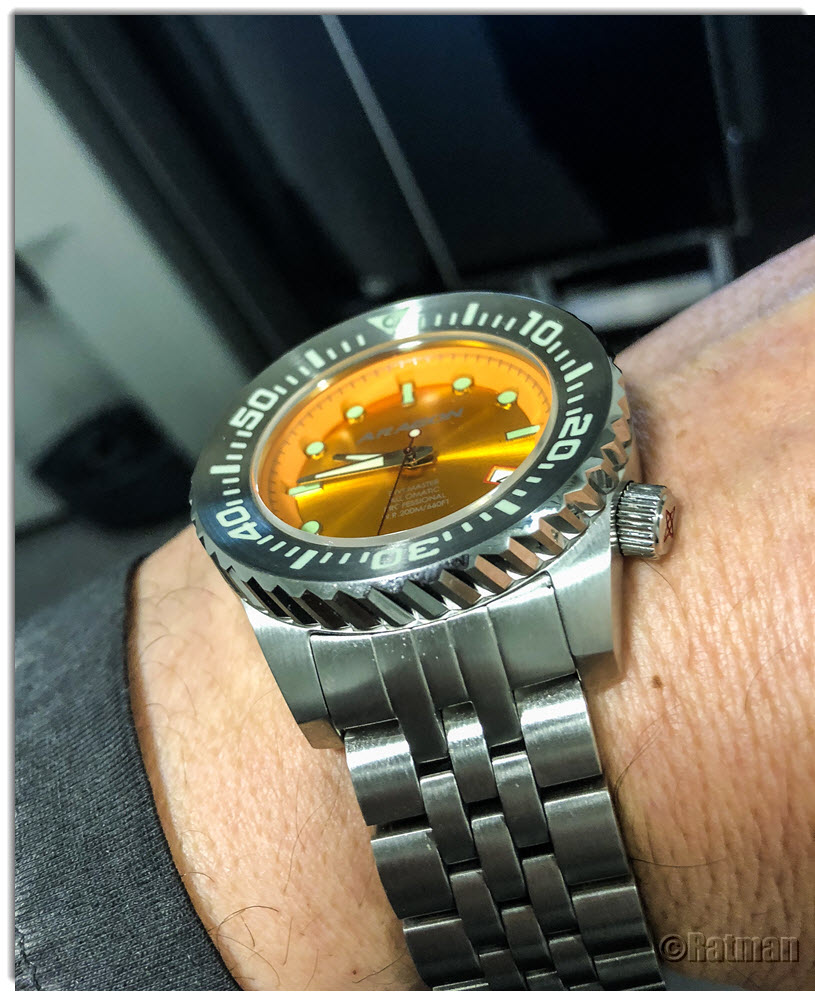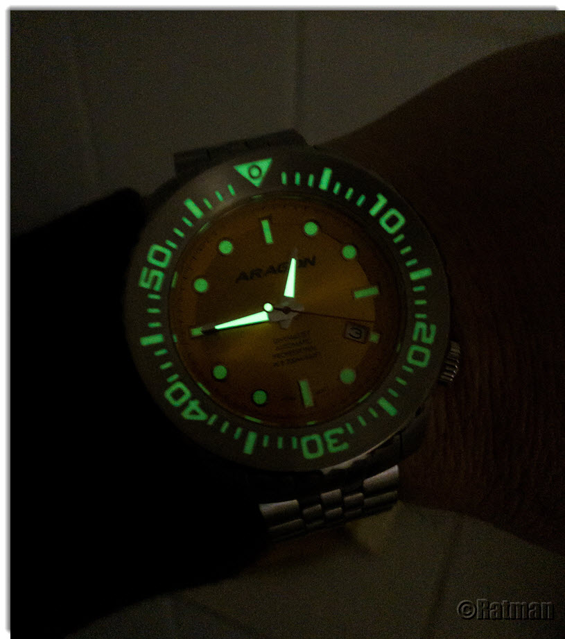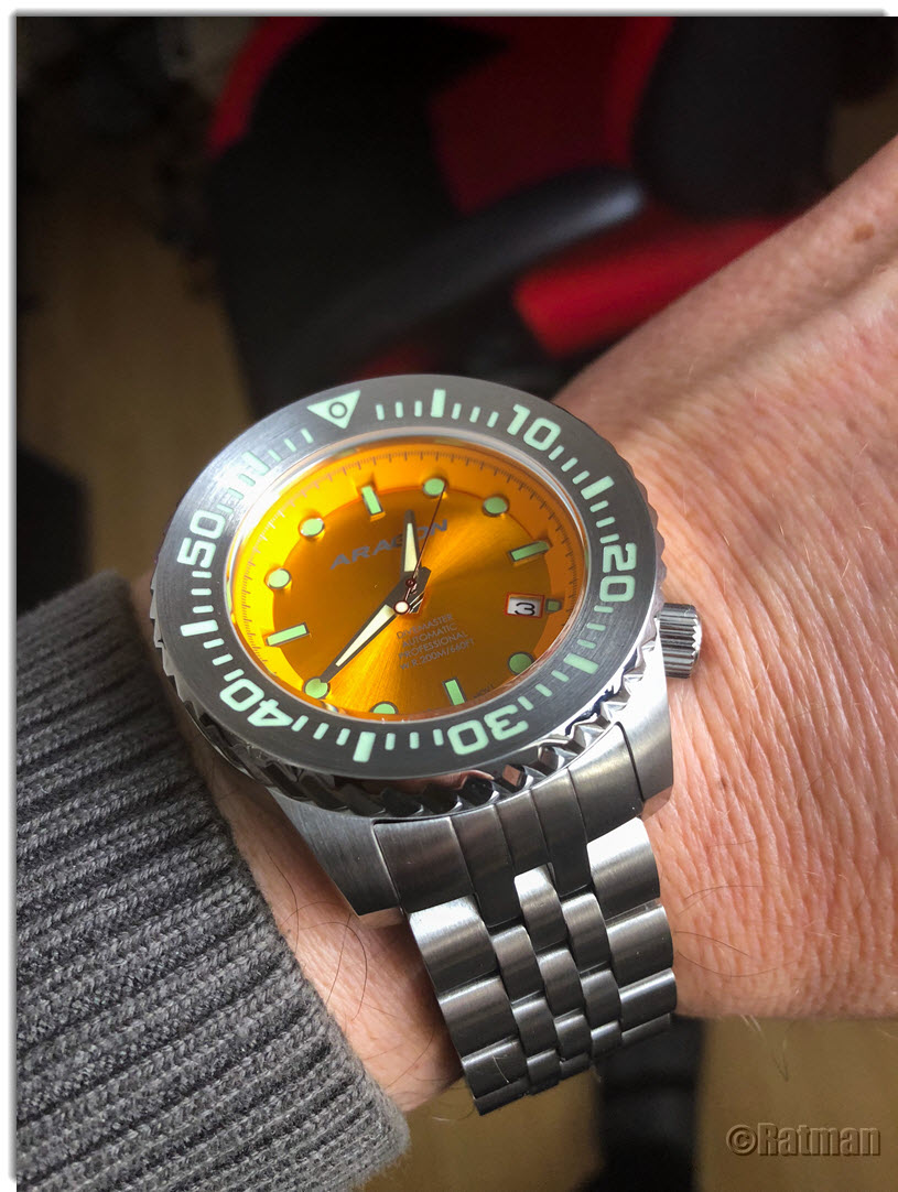 Wie auch immer: Die Uhr übertrifft meine Erwartungen: Ein sattes Orange auf dem Zifferblatt, dickes, schweres Gehäuse, eine Lünette, die satt und ohne jegliches Spiel fein rastet und eine insgesamt tolle Fertigungsqualität. Sie ist ihr Geld mehr als wert. Übrigens auch eine tolle Lume, die Uhr wäre also auch was für ColonelZap