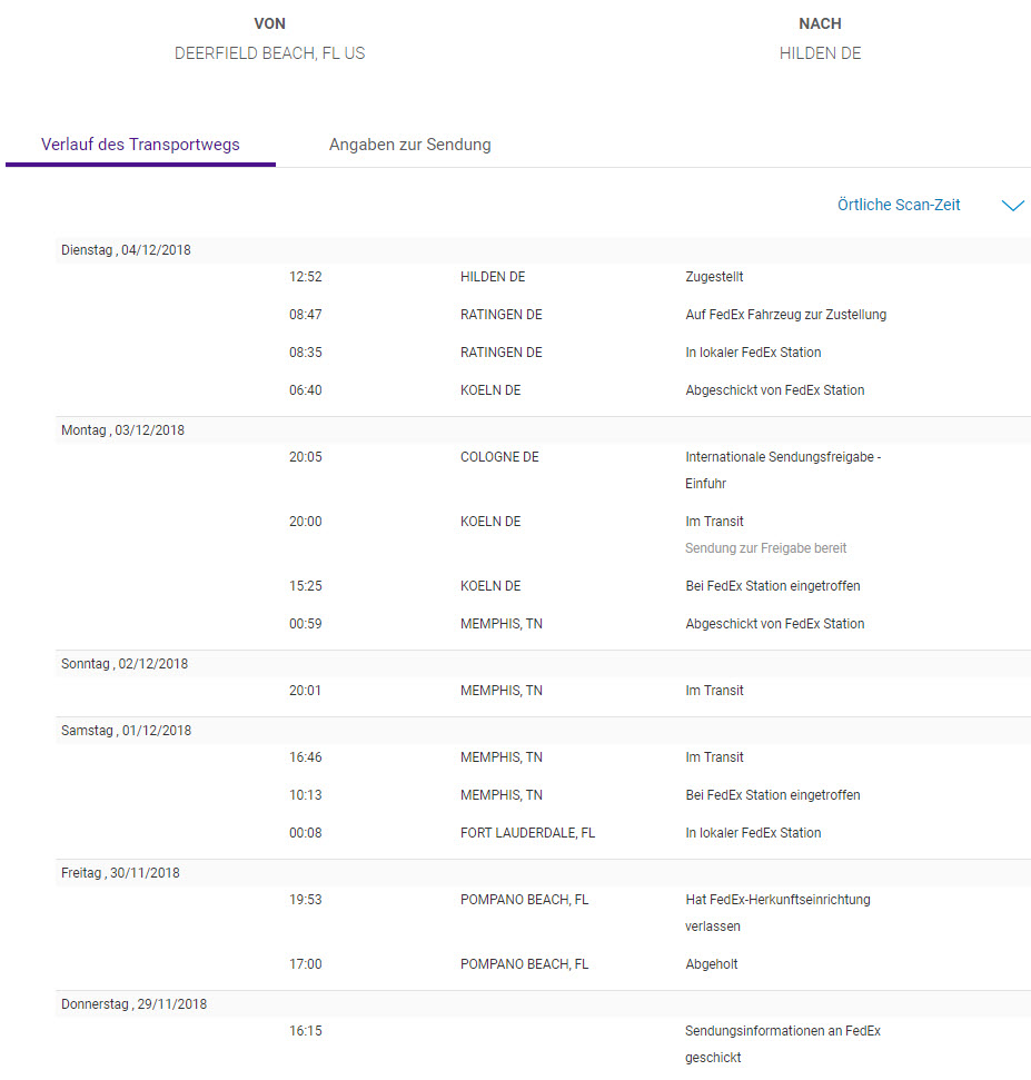 03 Dez. 2018 14:47 - 04 Dez. 2018 11:26Ich schaute daher mal schnell in meinem Mailpostfach nach, und tatsächlich: Ich hatte eine Nachricht von meinem Mailserver, dass der FedEx-Mailer meine Mail abgewiesen hat. Die Dame meinte, das käme schon mal vor und gab mir eine andere Mailadresse, die wohl direkt ihr zugeordnet sei. Ich habe dann die ursprüngliche Mail samt Anhängen an die neue Adresse weitergeleitet und hoffte, dass es damit gut sei. Diesmal konnte die Mail wohl zugestellt werden, da ich keine Fehlermeldung von meinem Mailserver erhielt.