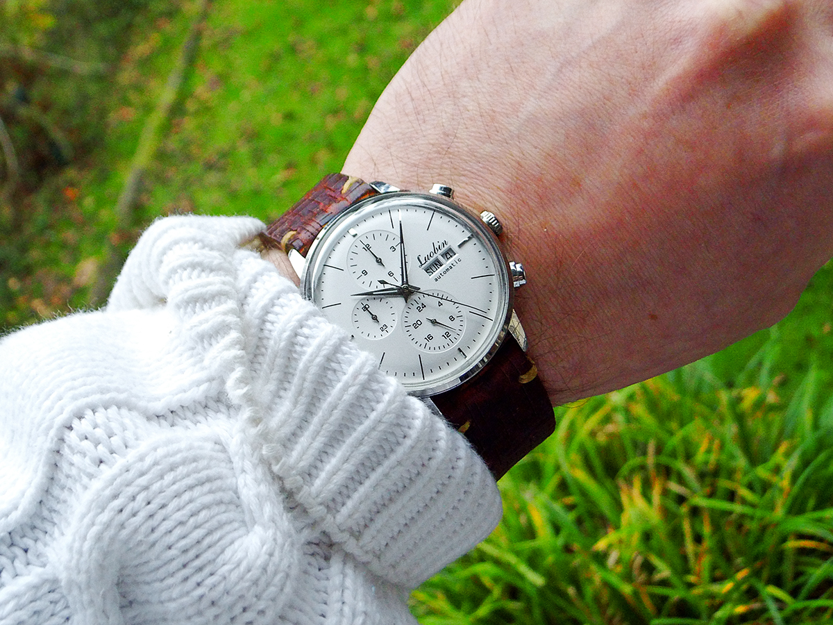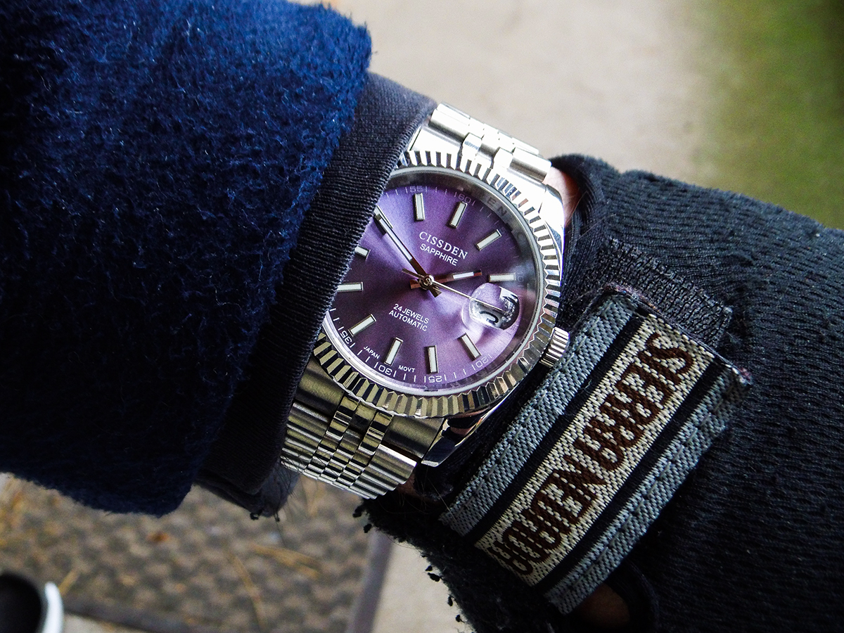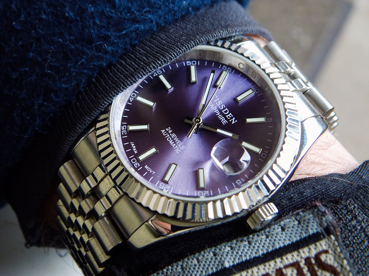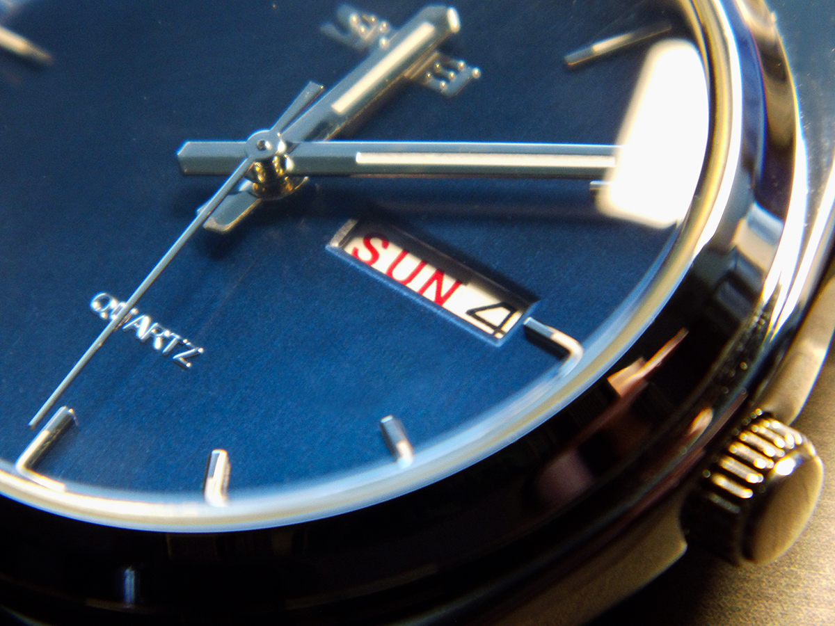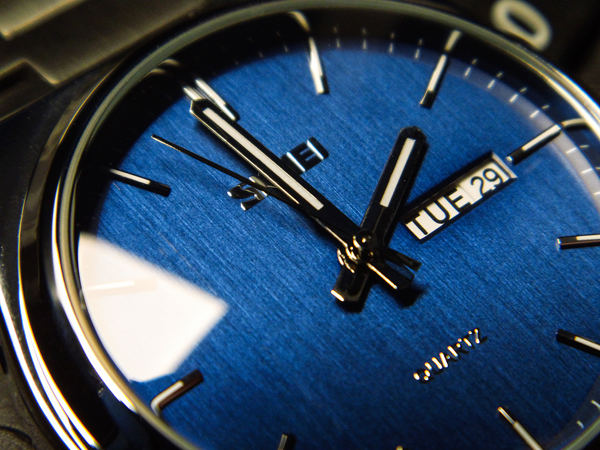 Das Zifferblatt hat einen schönen "Tapetenschliff" und changiert von blau bis schwarz, vielleicht schaffe ich es bei mehr Tageslicht noch bessere Fotos zu schießen.