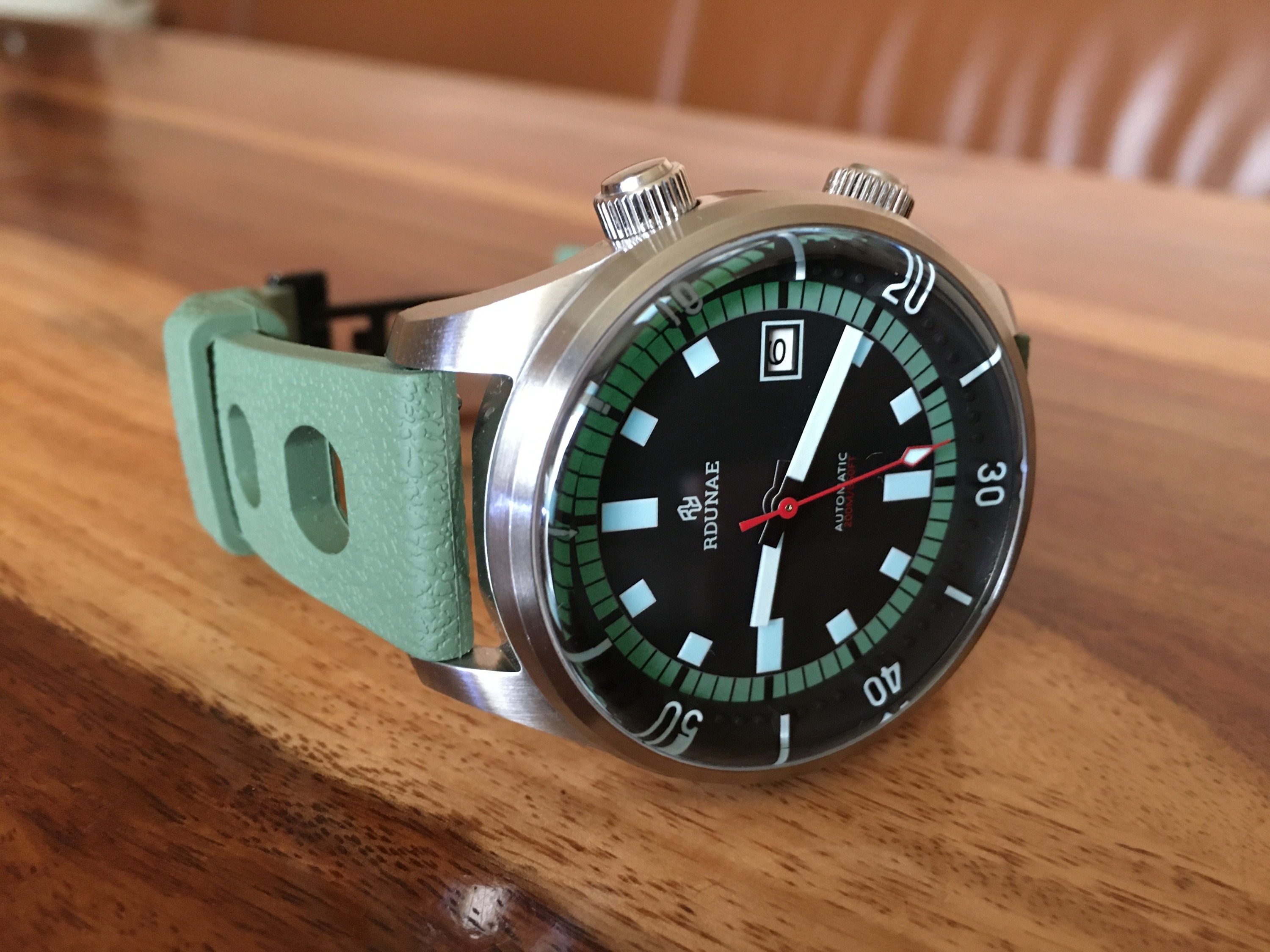 01 Jan. 2023 17:16 - 01 Jan. 2023 17:17Hm... die RDUNAE hat von beiden was, sowohl von der Dan Henry als auch von der Bradner. Aber es gibt auch deutliche Unterschiede, bei der Gehäuseform zum Beispiel. Und die RDUNAE hat keine Sekundeneinteilung wie die Dan Henry oder die Spinnaker. Ich vermute mal, dass die RDUNAE eine andere Uhr zitiert.Für mich sieht das sehr nach Dan Henry ausbeim Design haben die wohl ein wenig bei der Spinnaker Bradner abgeguckt.
