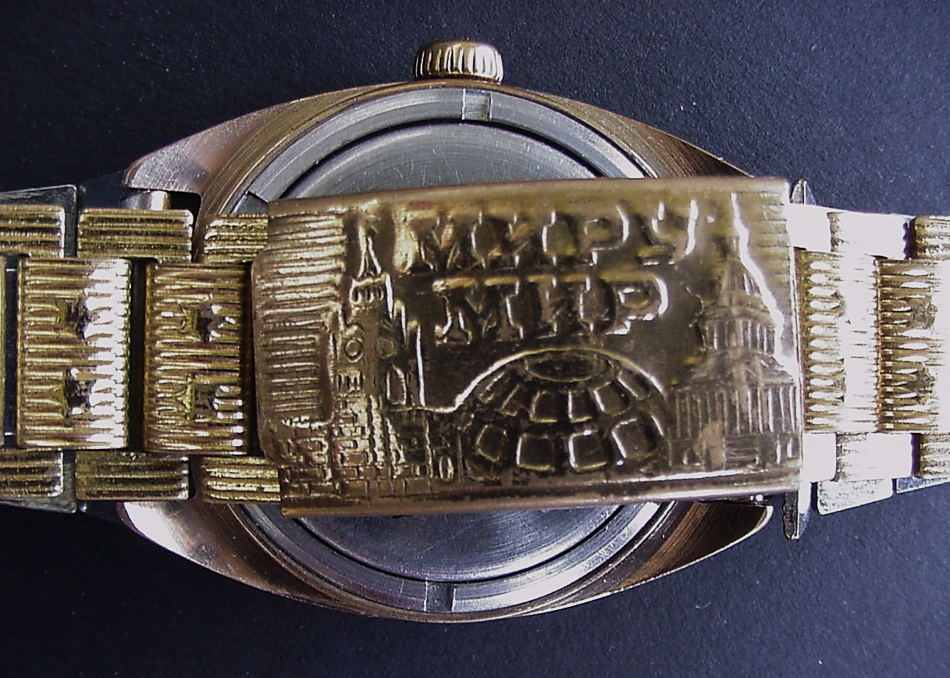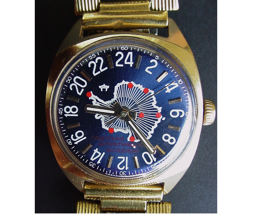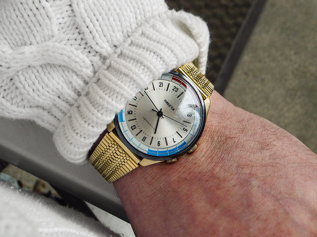 Hier meine Raketa-24h Antarctica mit Raketa 2623.H (24h) und einem sowjetischen Propaganda-Band "Mir Miru"(Friede der Welt, mit Kreml und Capitol auf der Schliesse) aus der Gorbatschow-Ära. Die Bilder sind schon etwas älter und ich trage sie auch nicht heute. Mittlerweile habe ich den ganzen Staub unter dem Glas und auf dem Zifferblatt weggeputzt, sie ist ein echtes Schmuckstück und war nicht leicht zu bekommen in diesem guten Zustand. Sie stammt aus den frühen '80er Jahren. Ich plane schon seit einer Weile, mal neue bessere Fotos zu machen und die Uhr detailliert vorzustellen, vielleicht komme ich bald mal dazu...