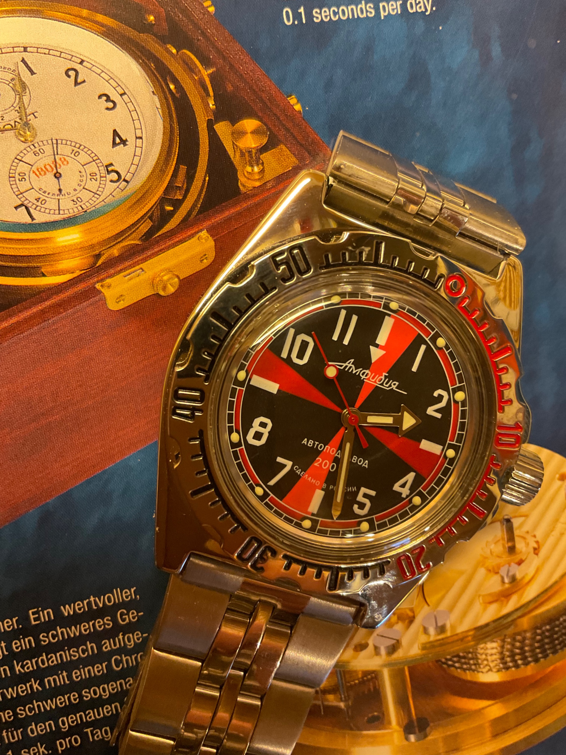Damit Russland nicht ganz ins Abseits kommt, zeige ich hier mal wieder die Vostok Radio Room, Taucheruhr, Automatik, Amphibia, Werk Kaliber 2415 mit 31 Steinen. Sie werden in Tschistopol, Provinz Tatarstan gefertigt.