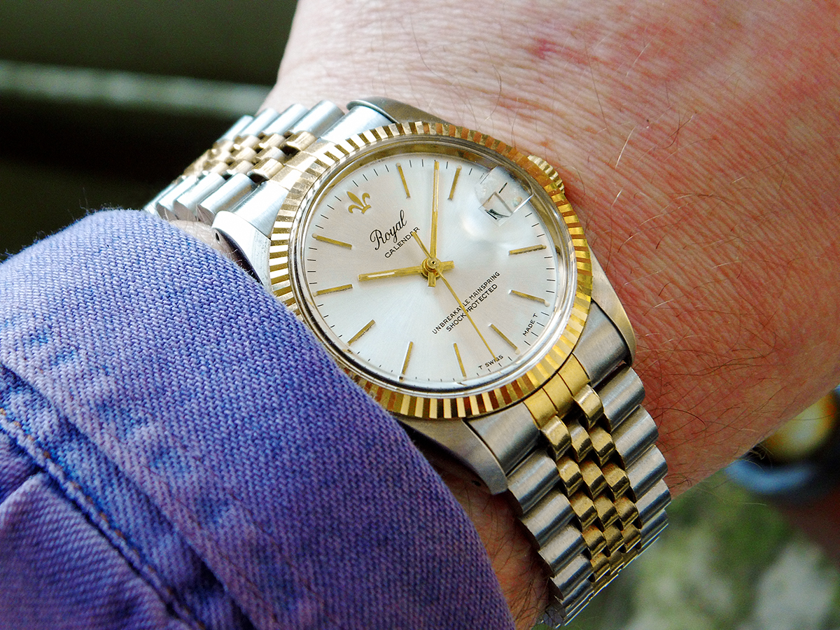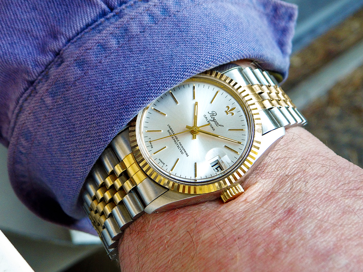 Und als Werk hat die berühmt-berüchtigte Royal 'Volks-Datejust' von 1980 ein Baumgartner 582 (CLD), das gleiche Kaliber mit Datum wie in den Lucerne- und Oberon-Scheibenuhren mit digitalem Jump-Hour-Scheibenmodul auf der letzten Seite.