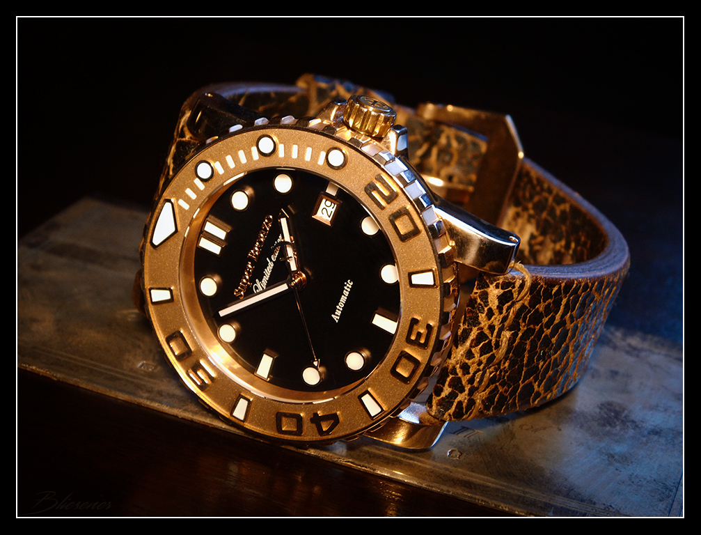 Hm, von dieser Uhrenmarke habe ich bisher noch nie etwas gehört. Microbrand? Auf jeden Fall meinen herzlichsten Glückwunsch! Und wie soll es anders sein: Ein großer schwerer Bronzeticker mit blauer Lume :