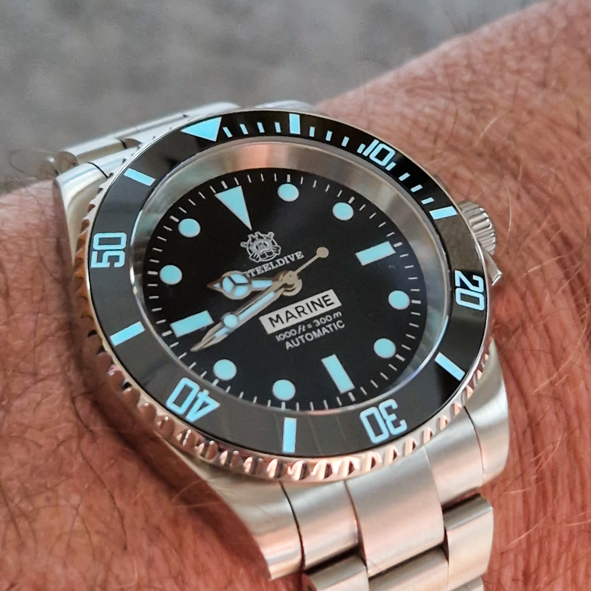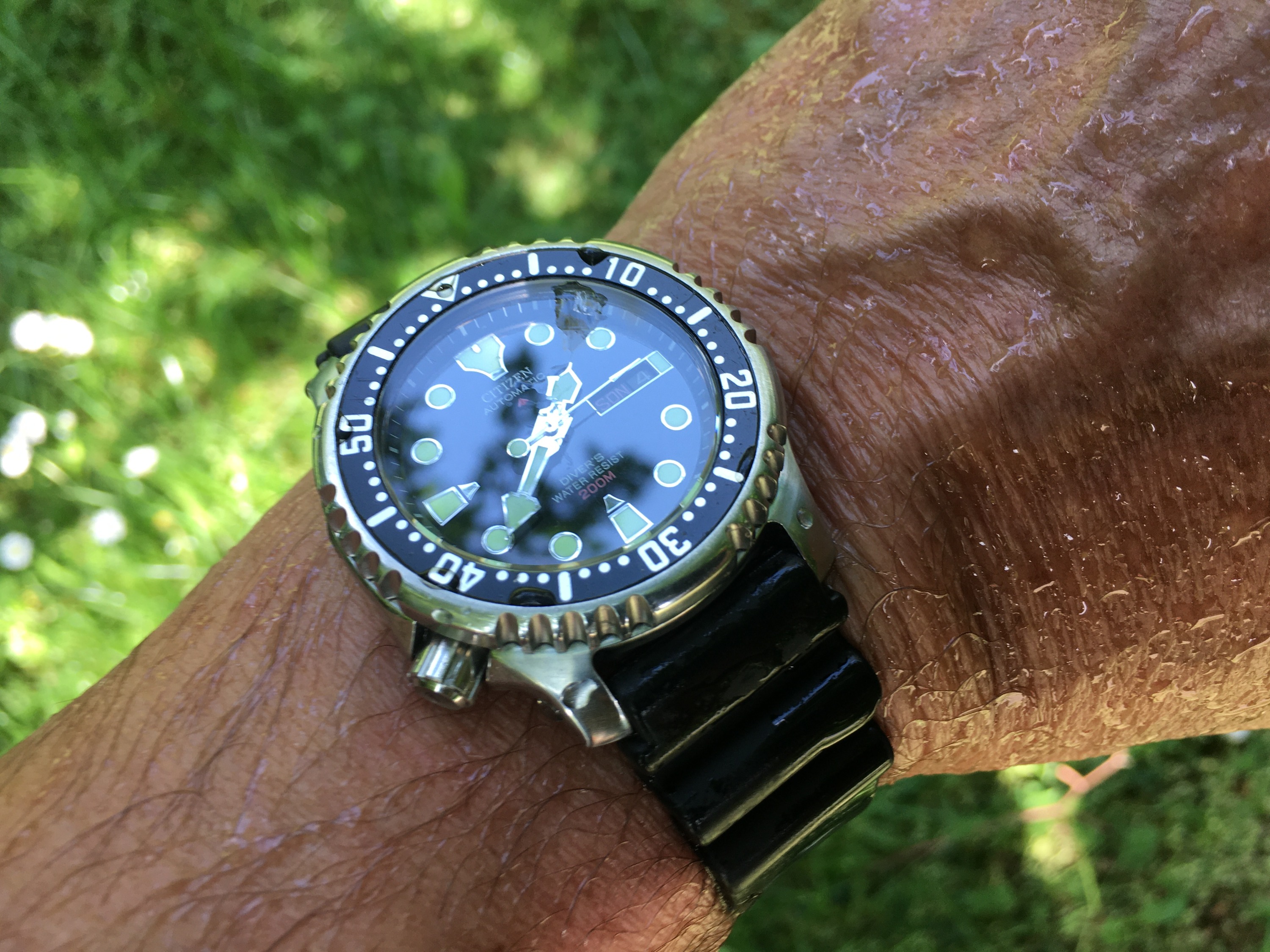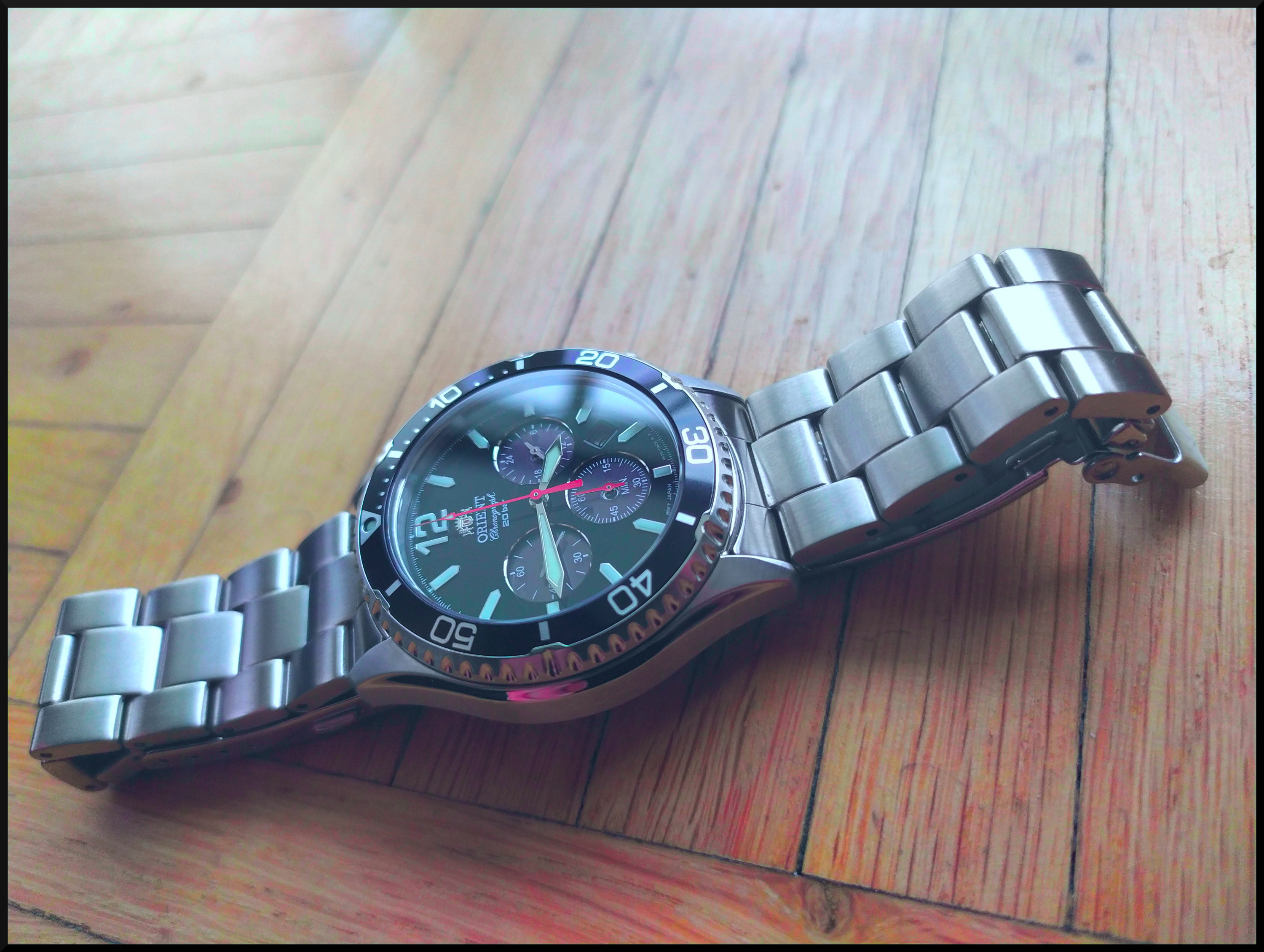 Beim Betrachten meines Fotos wunderte ich mich über diesen komischen Rand in der oberen Hälfte des Bezel-Inlays. Da war doch tatsächlich noch ne Folie auf dem Glas