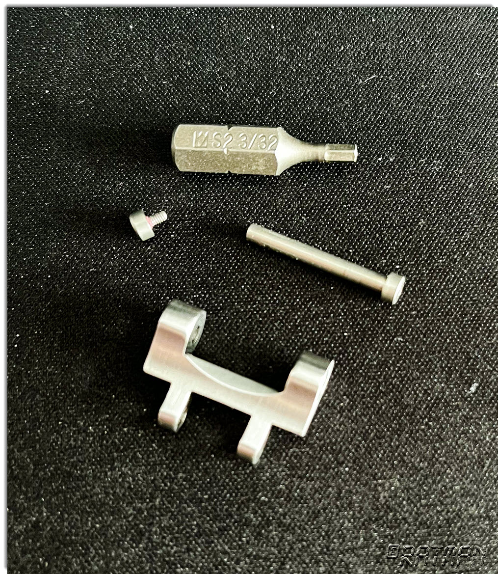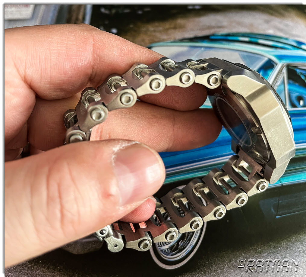 Hier nochmal im Detail eines der Bandglieder der Millipede Max GMT. Man sieht das winzige Gewinde im Vergleich zum massiven Bandglied. Für die Inbusschrauben benötigt man übrigens einen Schlüssel bzw. ein Schrauberbit im amerikanischen 3/32 Zoll Maß. Ein metrischer 2 mm Schlüssel ist zu klein, 2,5 mm schon zu groß. 3/32 Zoll entsprechen etwa 2,4 mm. Im amerikanischen Sprachraum heißen Inbusschlüssel übrigens "Allen-Key" oder auch "Hex-Key".