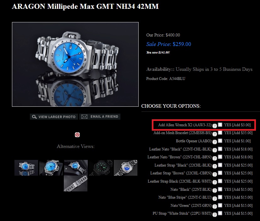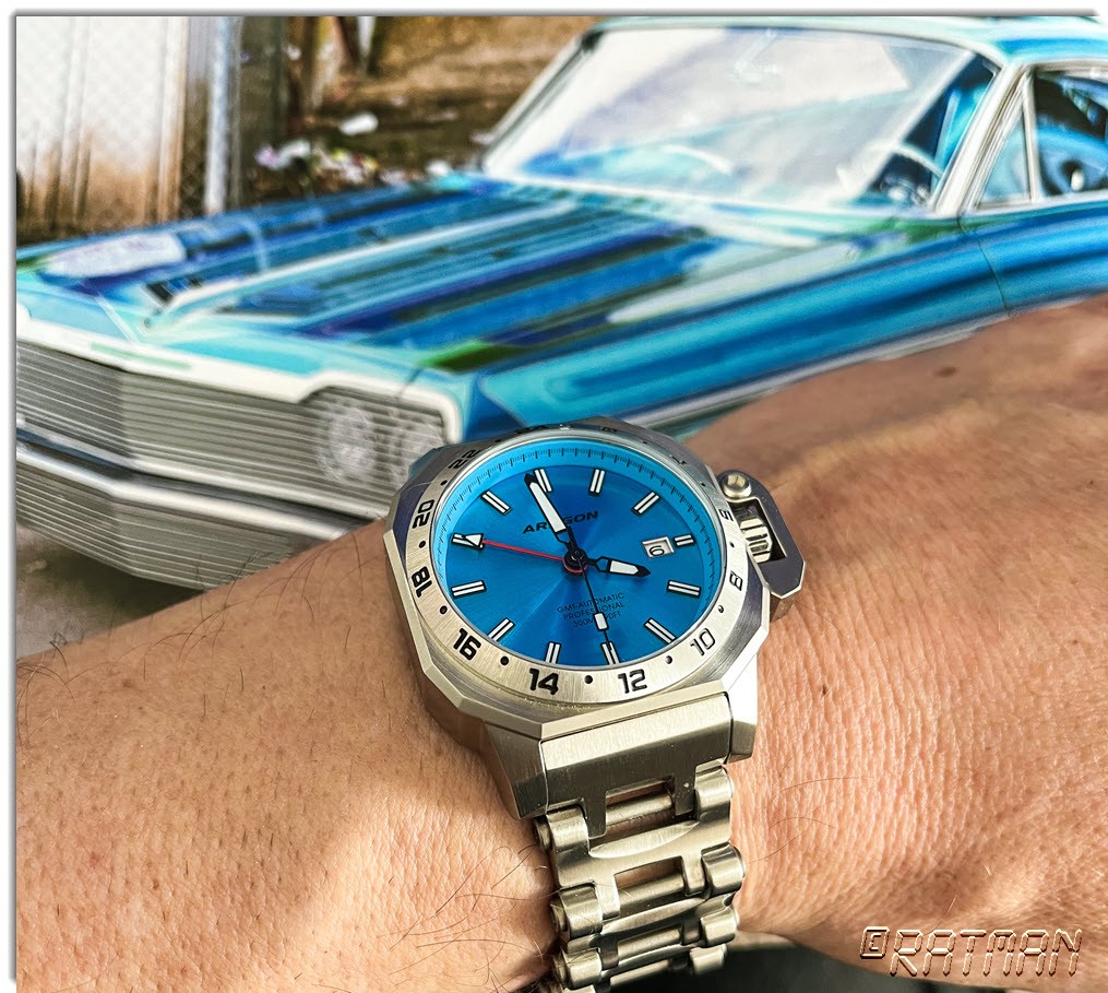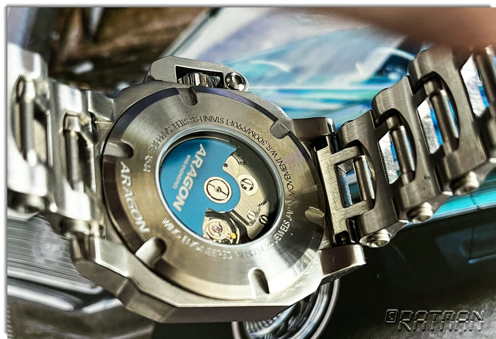 Die Aragon Millipede (Tausendfüssler) gefällt mir gut. Ein ungewöhnliches und eigenständiges Design, vor allem bei dem spektakulären Band, aber auch bei der Uhr und der Preis ist auch gut. Das helle metallische Blau, noch hervorgehoben durch die weiss-schwarzen Indices und Zeiger und durch das hohe blaue Rehaut, wirkt auf den Fotos fast psychedelisch. Der rote Zeiger ist wohl ein Stundenzeiger für eine zweite Zeitzone (GMT)?