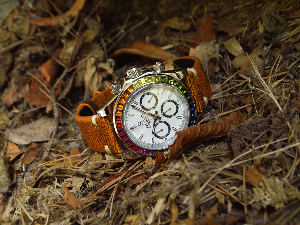 Durch dieses wirklich einzigartige Band bekommt das Ührchen nochmal eine Extraportion tooligen Look. Dazu kommt das Case mit seinen vielen Kanten und Brechungen. Chefdesigner Wing Liang ist vermutlich mit dem Vorsatz an diese Uhr gegangen, außer der Lünette keinerlei Rundungen zu verwenden. Eine echte Tool-Watch war das Ziel. Polierte Flächen sucht man vergeblich, alles ist mit einem feinen Brush-Finish versehen. Ein massiver Kronenschutzbügel rundet das ganze ab.