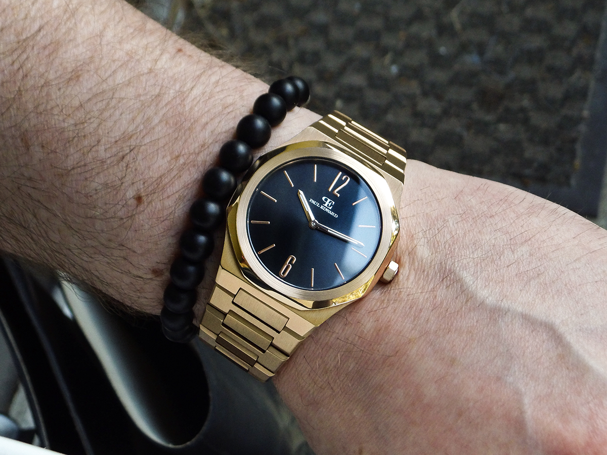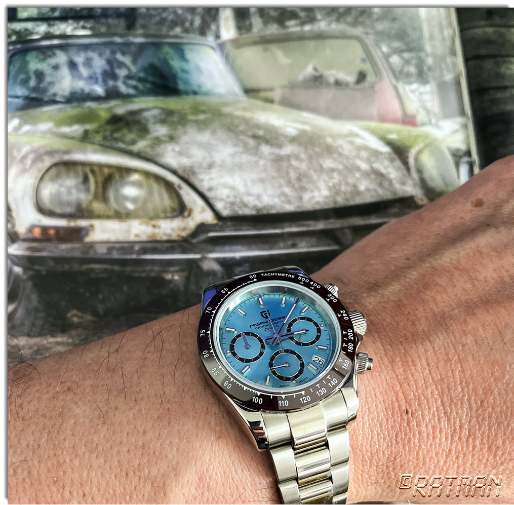 Ich muss sagen, die Hommage hat Pagani gut hinbekommen, selbst die Farbe der Lünette wirkt stimmig. Noch stimmiger wäre allerdings gewesen, wenn Pagani das Datumsfenster weggelassen hätte. Und leider gibts hier wieder mal die zwar schön aussehende, aber fummelige Pseudo-Glidelock Schließe, die das Ändern der Armbandlänge zum Geduldsspiel macht.
