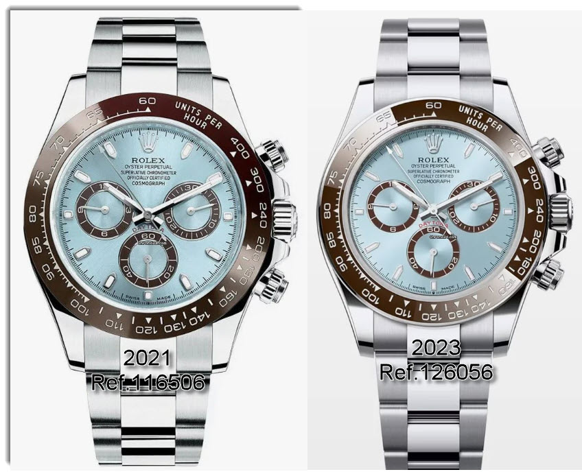 Eine Hommage an die RLX Daytona Platinum., Interessanterweise hat sich Pagani hier an der aktuellen Referenz 126056 diesen Jahres orientiert, mit den schmaleren Toti-Umrandungen und den nicht mehr "bauchigen" Indizes. Zum Vergleich alte und neue Referenz: