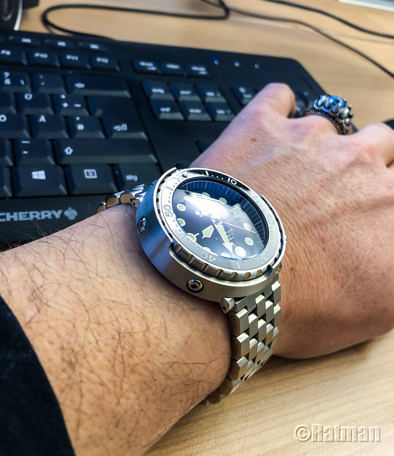 Das Original-Band musste leider weichen, ich steh nicht so auf diese Gummidinger. Statt dessen ein fettes Stahlgliederband mit polierten Flanken. Passt ganz gut, meine ich...