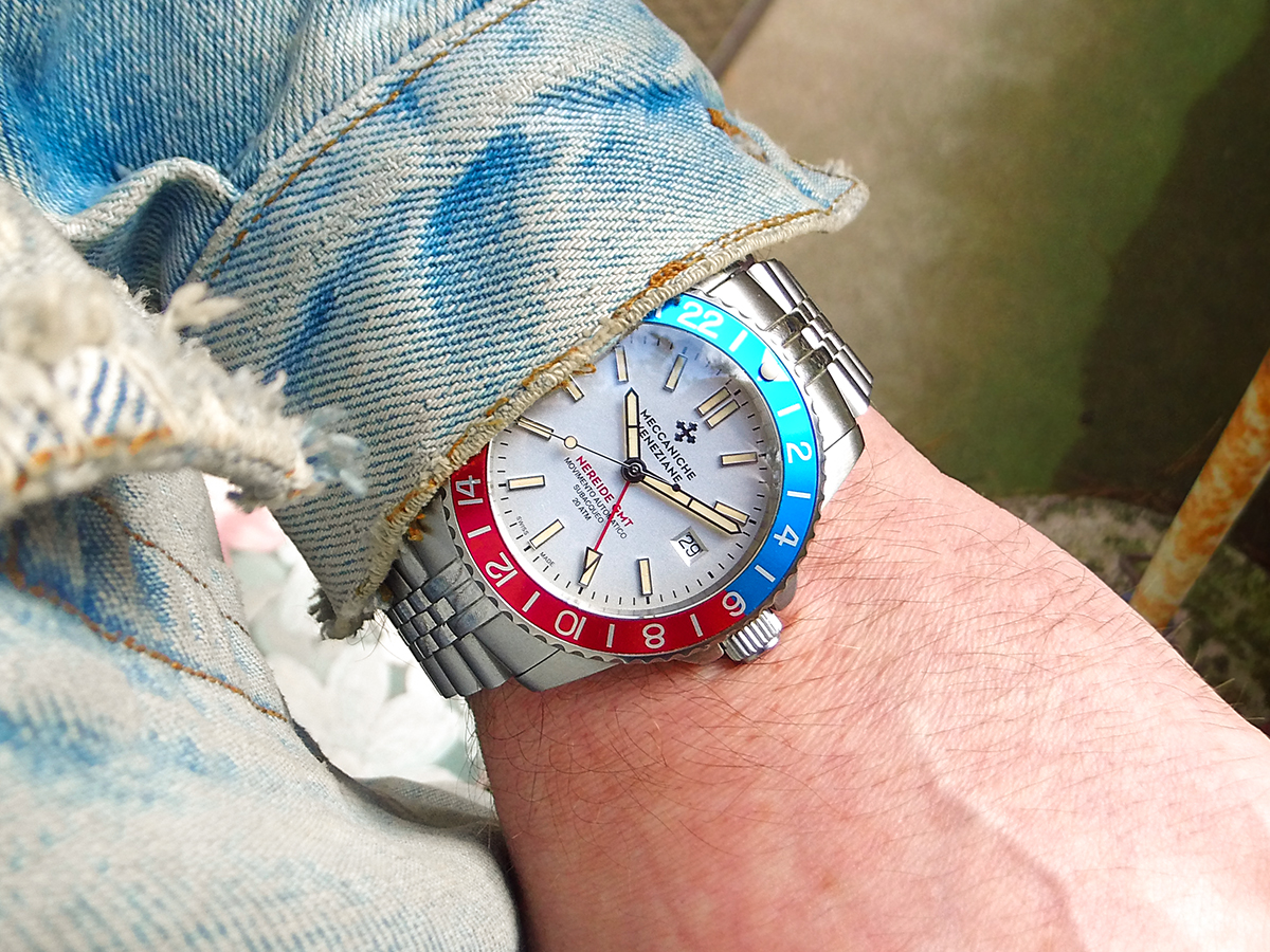 Und heute hab ich mich auch mal durchgerungen, ein Foto zu machen. Das ist ein schreckliches Gefummel, wenn man mit dem glatten glitschigen Handy in der rechten Hand (wo zusätzlich der Auslöseknopf total ungünstig auf dem Display positioniert ist) den verkrampften linken Unterarm fotografieren soll, wobei die Uhr möglichst auch noch scharf sein soll.