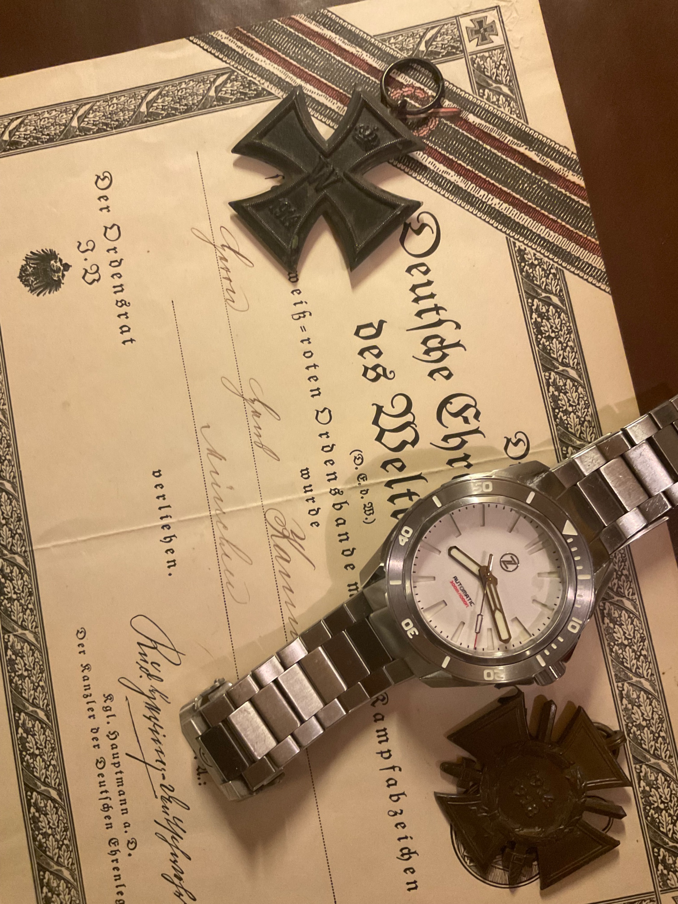 Noch ein paar Worte zu den beiden Kreuzen des ersten WK (das Wort Orden vermeide ich) es sind Erbstücke, die ich in Erinnerung halte, Erinnerungen an einen Krieg der 10 Millionen Tote gekostet hat, ganze Jahrgänge blutjunger Menschen wurden ausgelöscht. Menschen für ihr ganzes Leben verstümmelt und psychisch gestört, durch stundenlanges Trommelfeuer, dahinvegetierent in versumpften Gräben neben Ratten und Toten. Und man hat nichts daraus gelernt…