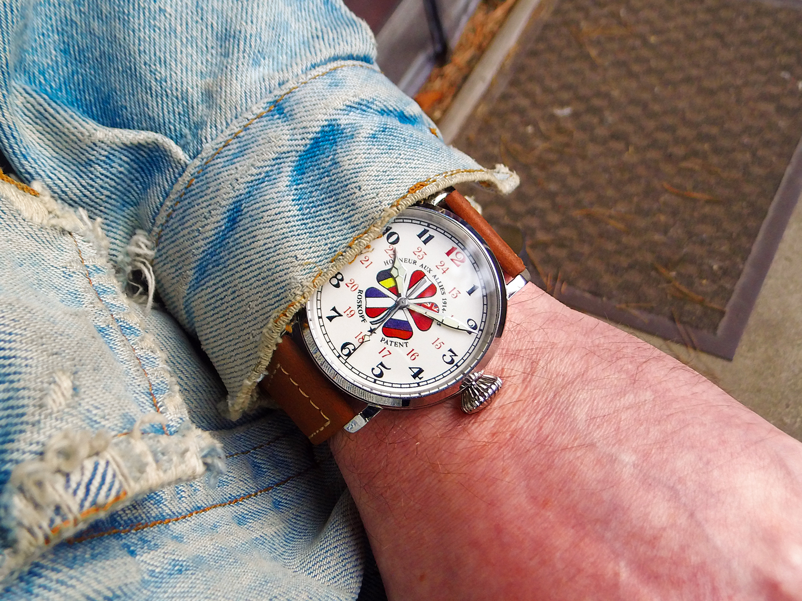 Die Flaggen auf den Zifferblatt symbolisieren diese Länder. Die Uhr ist eine Hommage an die mit „Trench-Watch“ bezeichneten Grabenuhren des ersten WK. Diese hatten größtenteils keine Hörneranstoße wie deine, sondern Drahtbügel zum befestigen des Armbandes. Die Uhren waren überwiegend Taschenuhren, die am Arm befestigt wurden. Somit hatte der Soldat beide Hände frei für den Waffengebrauch, und brauchte nicht dauernd in der Hosentasche rumzusuchen. Außerdem hatten fast alle Uhren einen Splitterschutz, der zusätzlich mit den Armband, bzw. den beiden Bügeln verbunden war. Die Offiziere waren die ersten die mit Armbanduhren ausgerüstet wurden, denn die Angriffe wurden auf die Sekunde genau vorbereitet, und diese mußten die Mannschaften führen, das heißt als erste aus den Schützengraben raus. Und hatten dadurch auch die größten Verluste. Man lernte aber sehr schnell daraus, und setzte als Führung für die Frontalangriffe die niederen Chargen ein! Denn Offiziere waren rar gesät und deshalb kostbar!