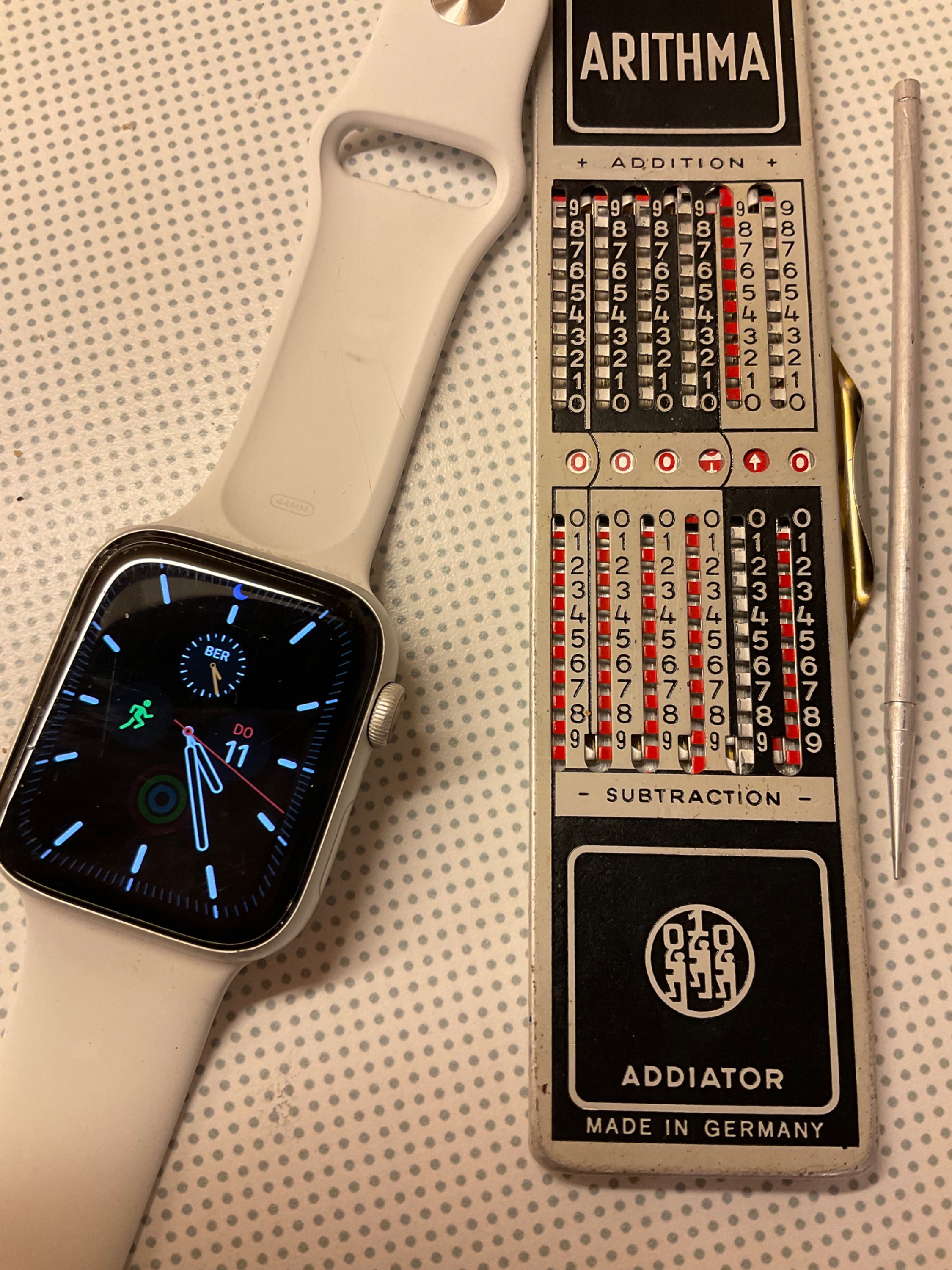 AppleWatch 6 und der Arithma Addiator, der Rechenknecht der 50er Jahre