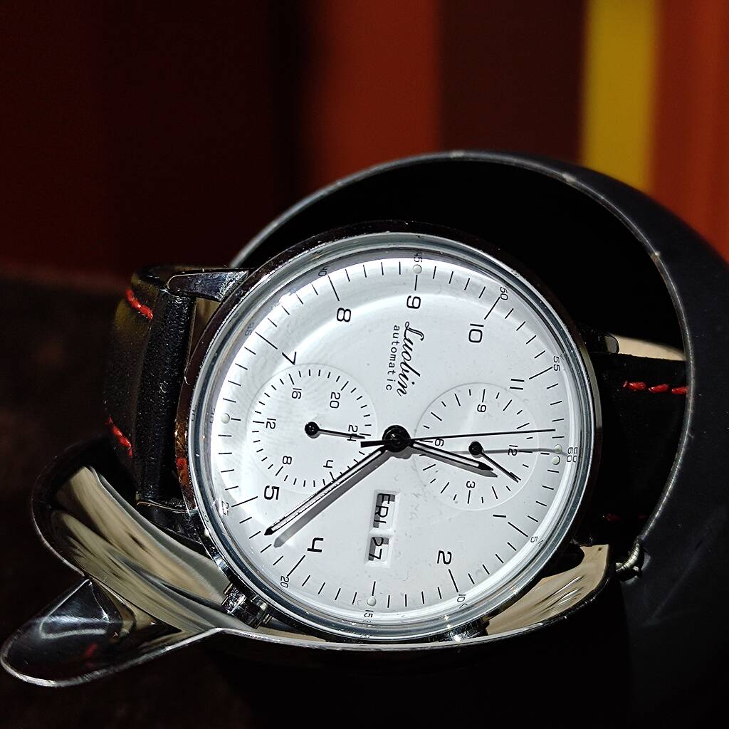 Witzige Details: der untere Knopf ist ein Soda-Knopf, er ist nur so da, hat keine Funktion, und den Monat muss man mit dem oberen Knopf manuell weiter stellen. Dafür schönes Bauhaus-Design, die Leuchtpunkte (und die Zeiger) leuchten gut in der Nacht; Hardlex-Kunststoffglas, Glasboden und 3bar Wasserdichtigkeit runden das ganze ab. Das Gliederarmband mit der fürchterlichen Butterfly-Schließe (wer denkt sich sowas aus?!...) habe ich gegen ein hier auf dem Trödelmarkt gekauftes 10€-Lederarmband mit Klappschließe getauscht, denn das mitgelieferte "Leder"-Armbad ist auch nur so meh.