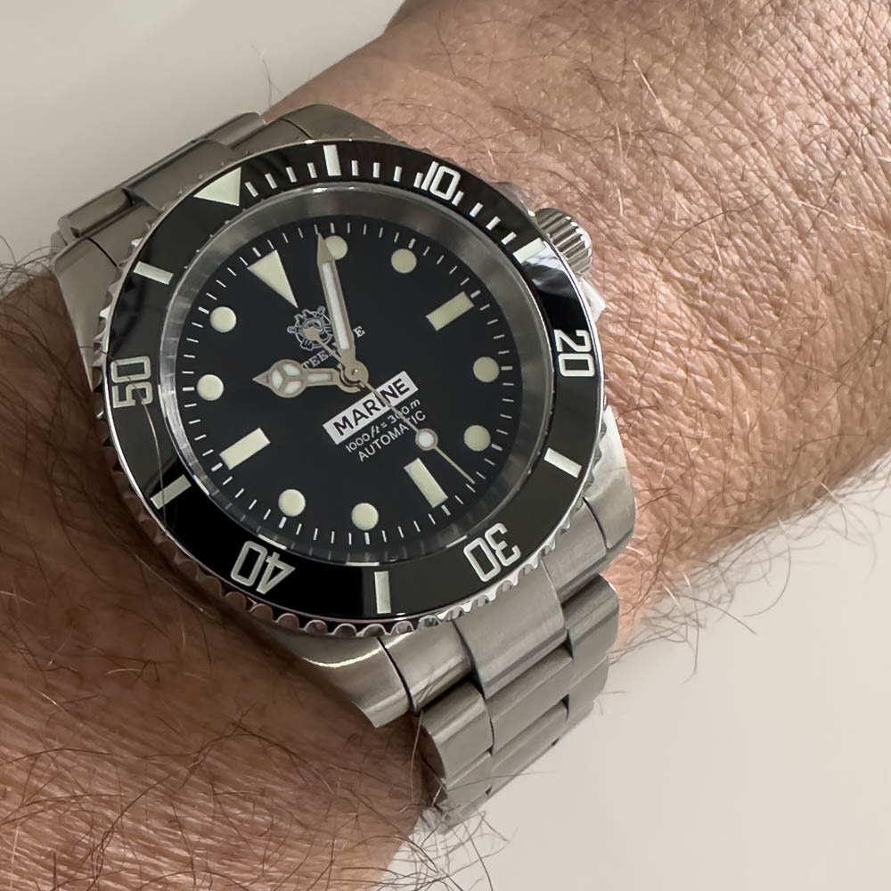 Aber die Zelos „Swordfish“ mit NH35, Automatik, 200 m WD, Superluminova C3 ist auch im Wasser noch benutzbar.