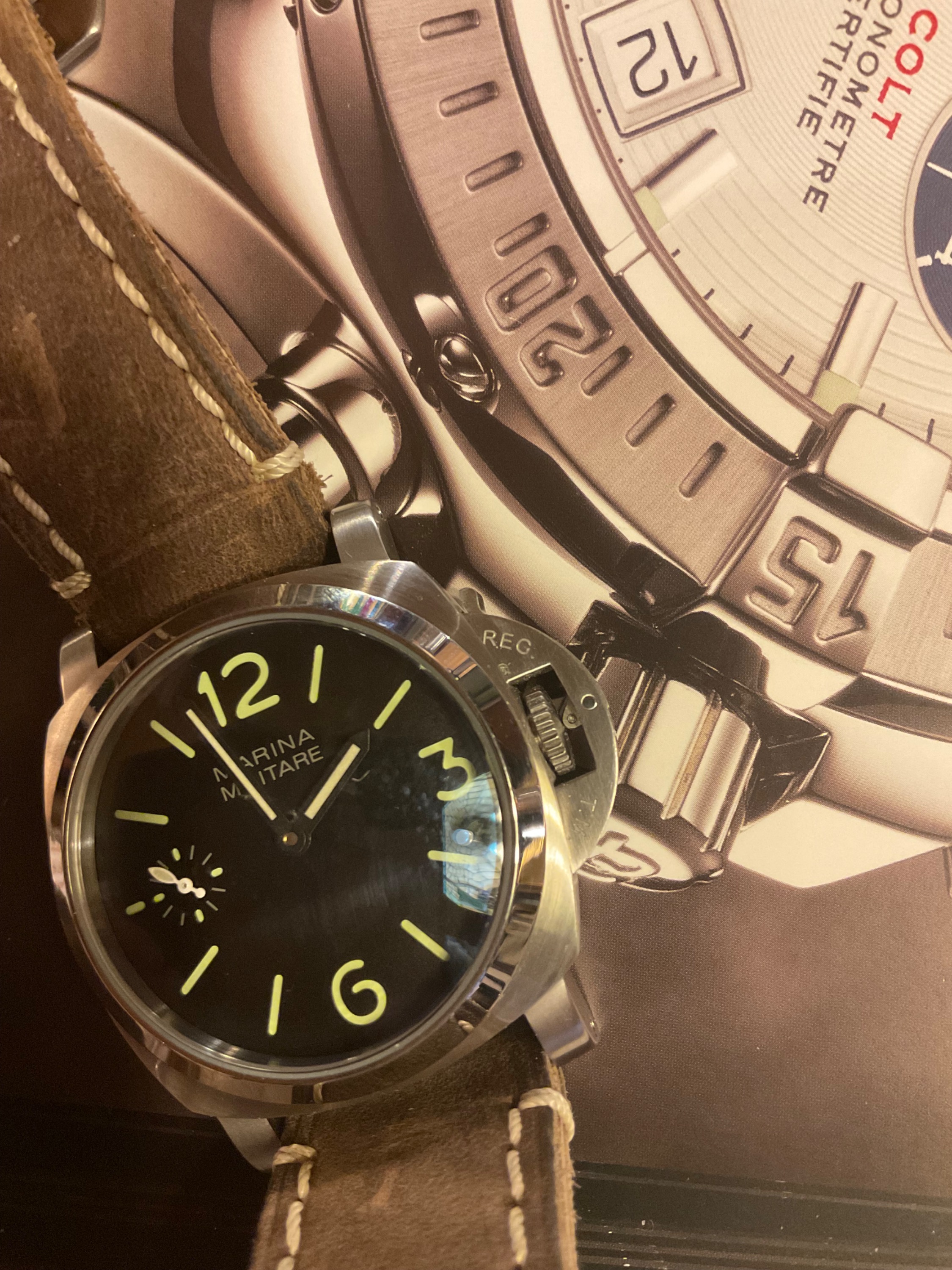 Es ist die Parnis „Marina Militare“, lange Zeit umstritten wegen des „geschützten Namens“, (bis heute ist mir unklar, ist er oder nicht?) Verbannt auf die „Black List“, deshalb gleich ein Grund damals sie mir zu kaufen. Das heißt der wahre Grund war ihre besser Hälfte, nämlich von hinten gefällt sie mir besser als von vorne. Und eine „Schwanenhalsregulierung“ besitzt sie auch noch, ob bloß angedeutet oder real funktionierend? Warum sich so viele auf den Namen „Marina Militare“ stürzen, ist mir sowieso ein Rätsel. Vermute mal, da die italienische Kampfschwimmereinheit bekannt für ihre risikoreichen Einsätze waren. Bei unseren Nachbarn (UF) liest man da von so manchen tapferen Einsatz, aber natürlich mit den Original am Arm. Zu Zeiten als ein…. das „Imperium Romanum“ gründen wollte, war die italienische Kriegsmarine schnell verschwunden, als die Royal Navi am Horizont erschien. Ja, ich weiß, ich bin wieder off-Topic, aber nachdem im UF nur soviel von den Heldentaten der italienischen Kampftaucher Einheit geschwärmt wird, dachte ich, bringe da auch etwas…..