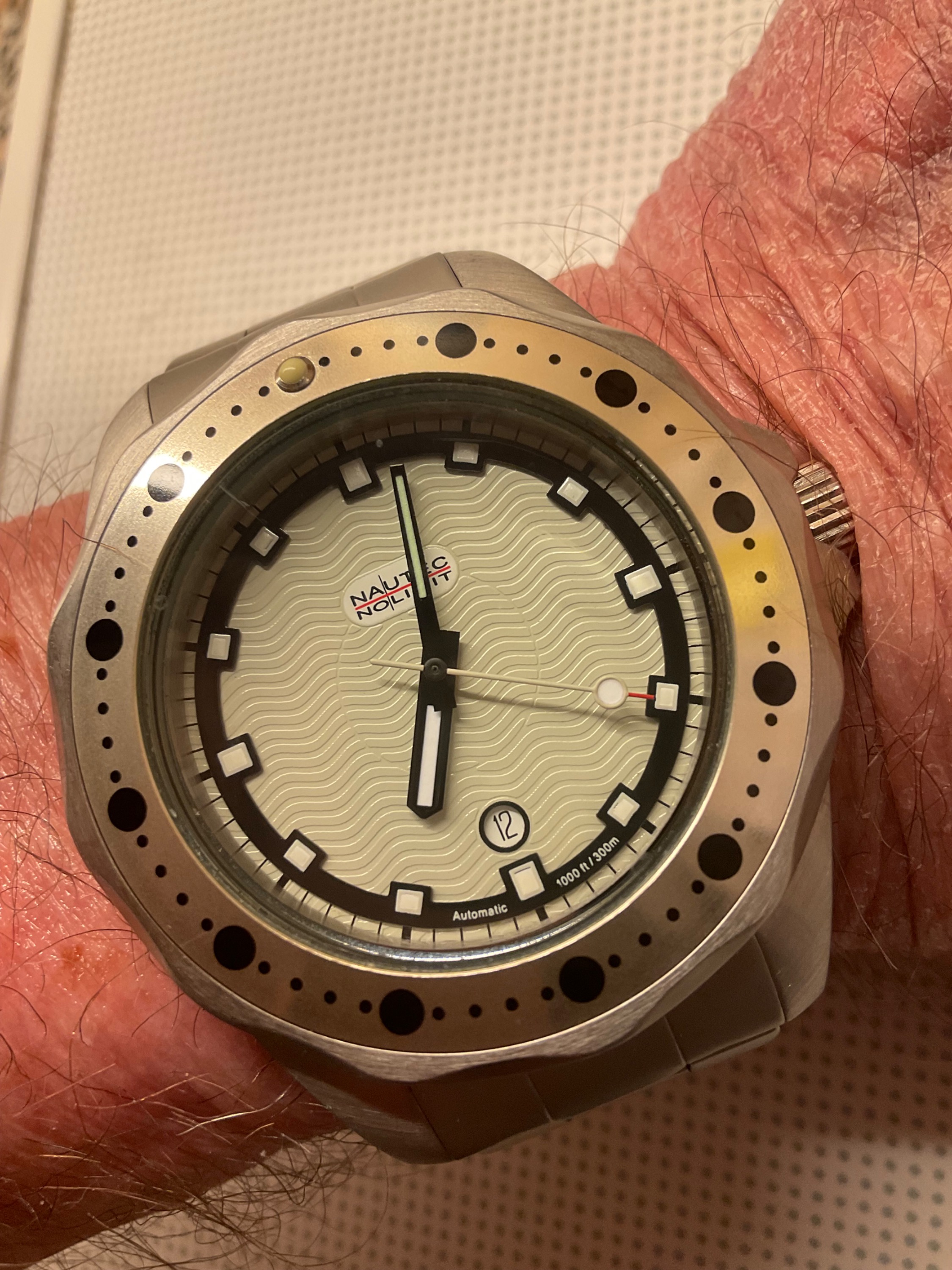 Nautec NoLimit Automatik 45mm, WD 30 bar, meine schwerste Uhr (nächste Anschaffung eine Waage, wer hat sowas?)Gekauft vom Wiener Motocross - Fahrer im UF, deshalb auch eine sehr robuste und widerstandsfähige Uhr, dazu gute Gangwerte und solide Verarbeitung
