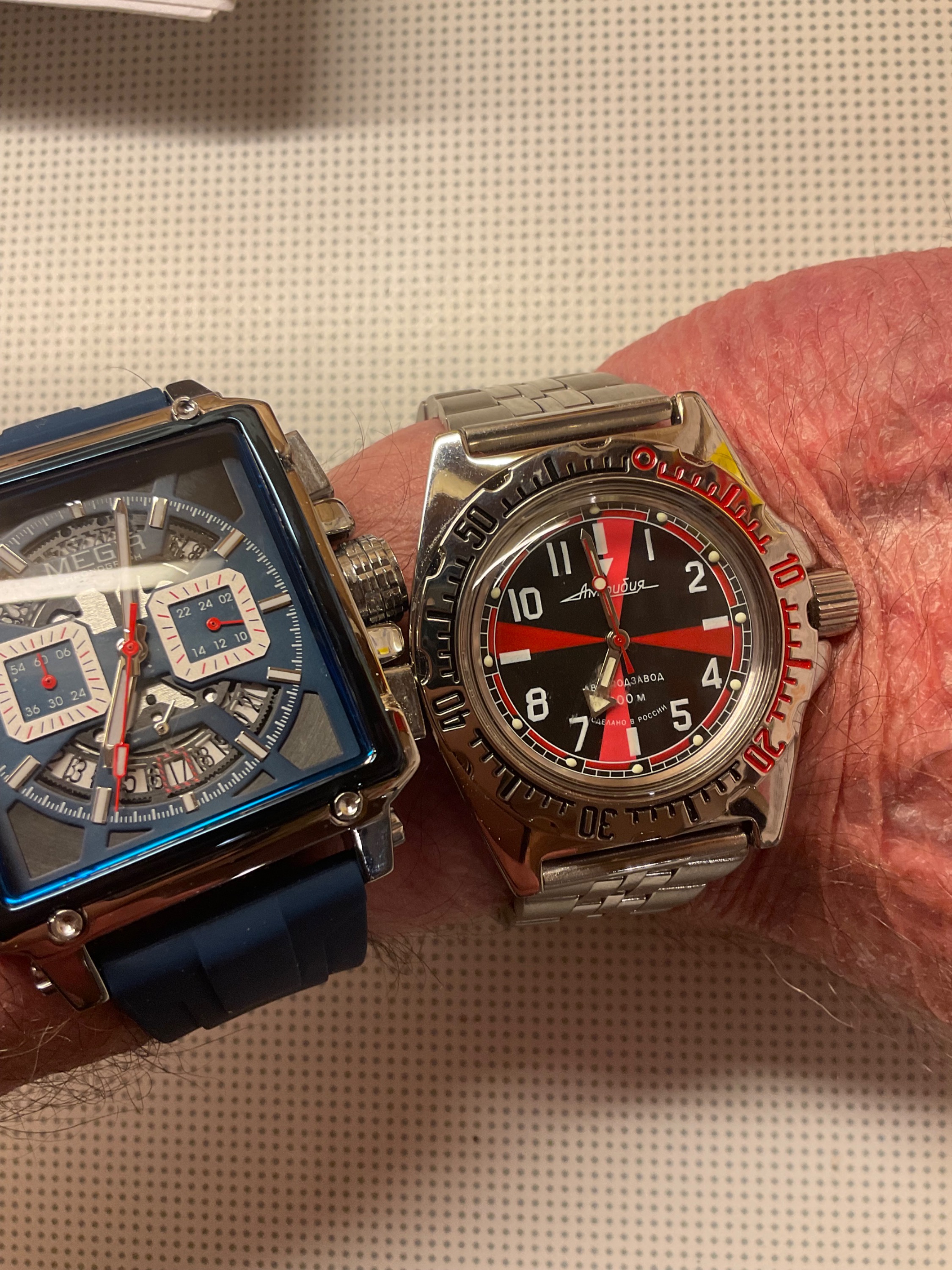 Nachdem heute die russischen Uhren themenbeherrschend sind, habe ich gleich noch die Vostok Radio Room zu meine Megir dazugetan. Die Megir mausert sich immer mehr zu meiner Lieblingsuhr heraus, bloß mit der WD da traue ich ihr ihr nicht so recht!? In einer Woche geht sie jetzt zweiMinuten vor, gar nicht so schlecht!