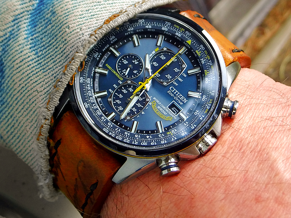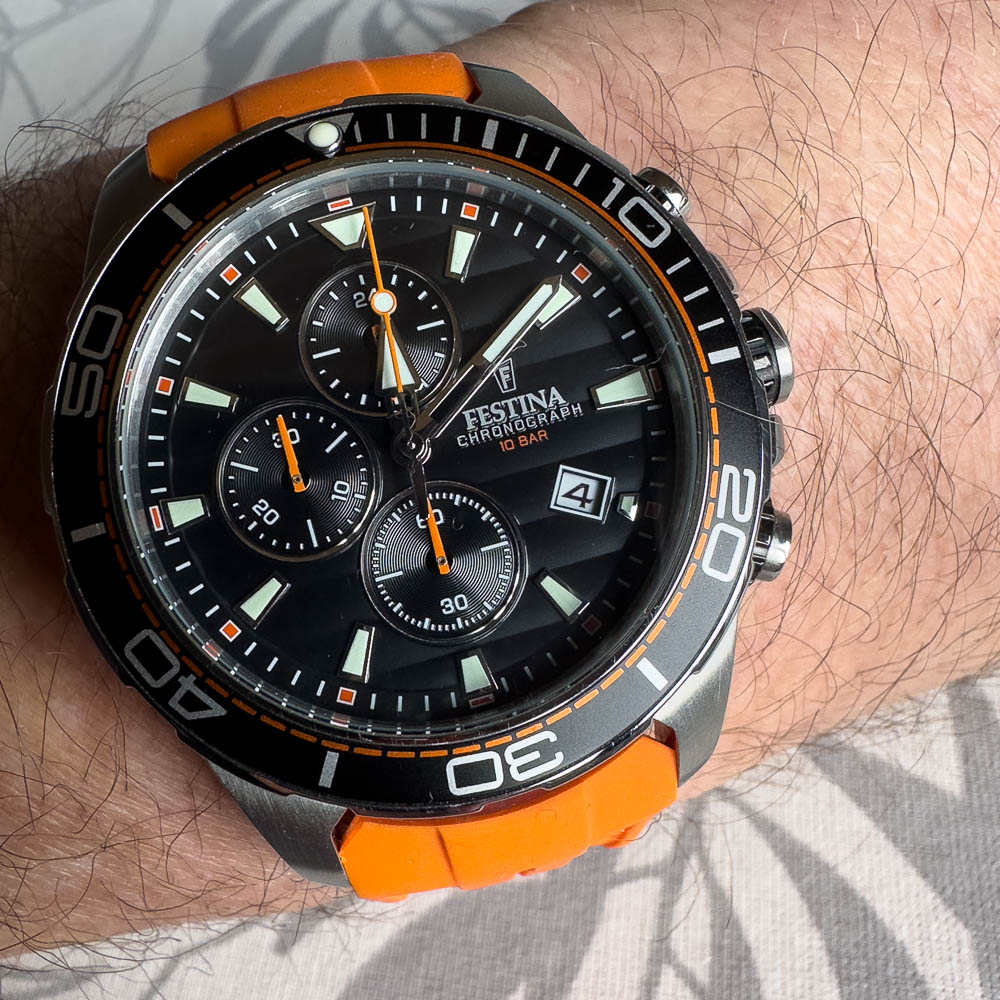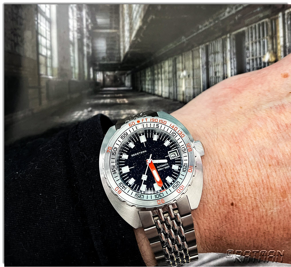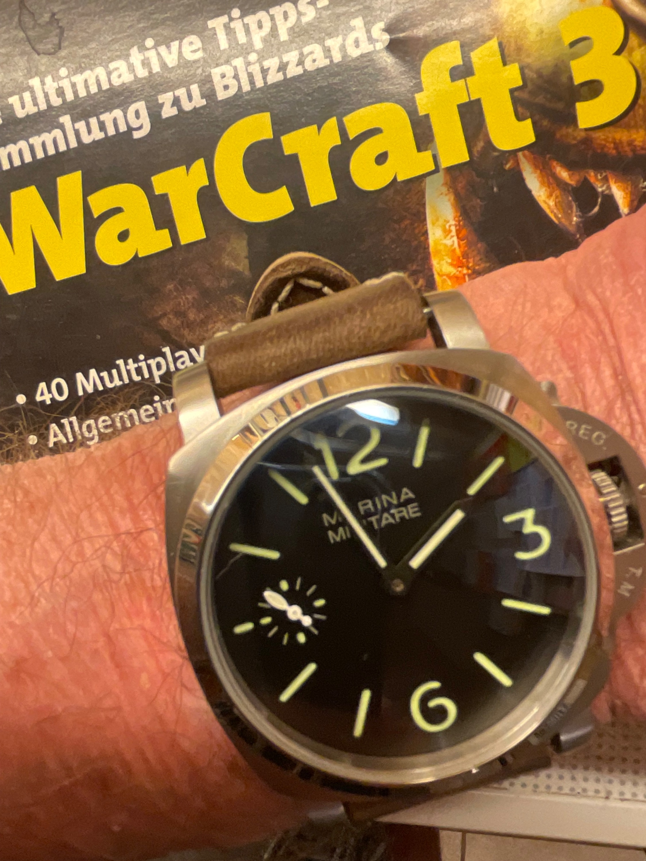 Marina Militare (meine erste Uhr die ich mir aus Trotz, sie stand auf der „berüchtigten Blacklist“, beim Eintritt hier, kaufte! Sie hat bloß eine unangenehme Eigenschaft, sie zieht alle Lichter auf sich! Darum etwas unscharf, ich konnte meinen Arm nicht mehr verzerren, sonst wäre er aus der Schulter gesprungen!