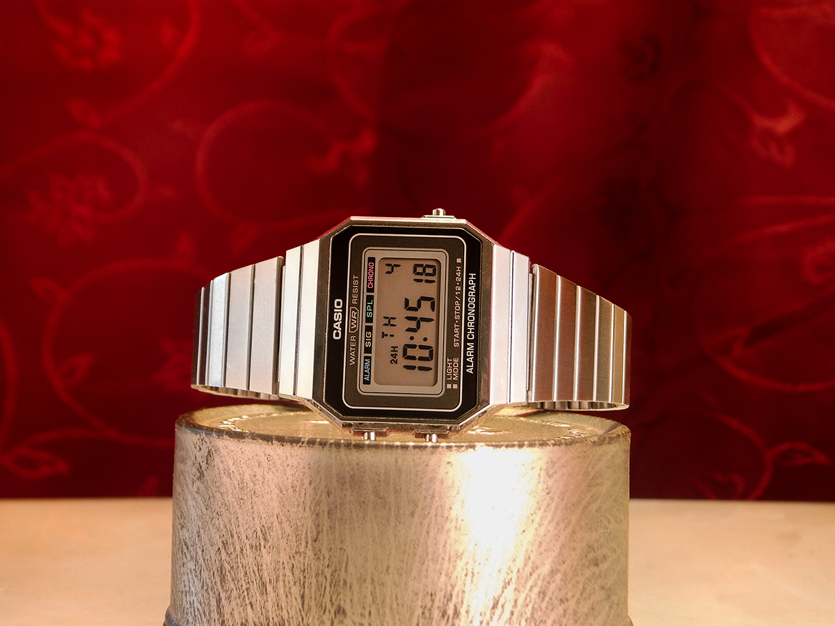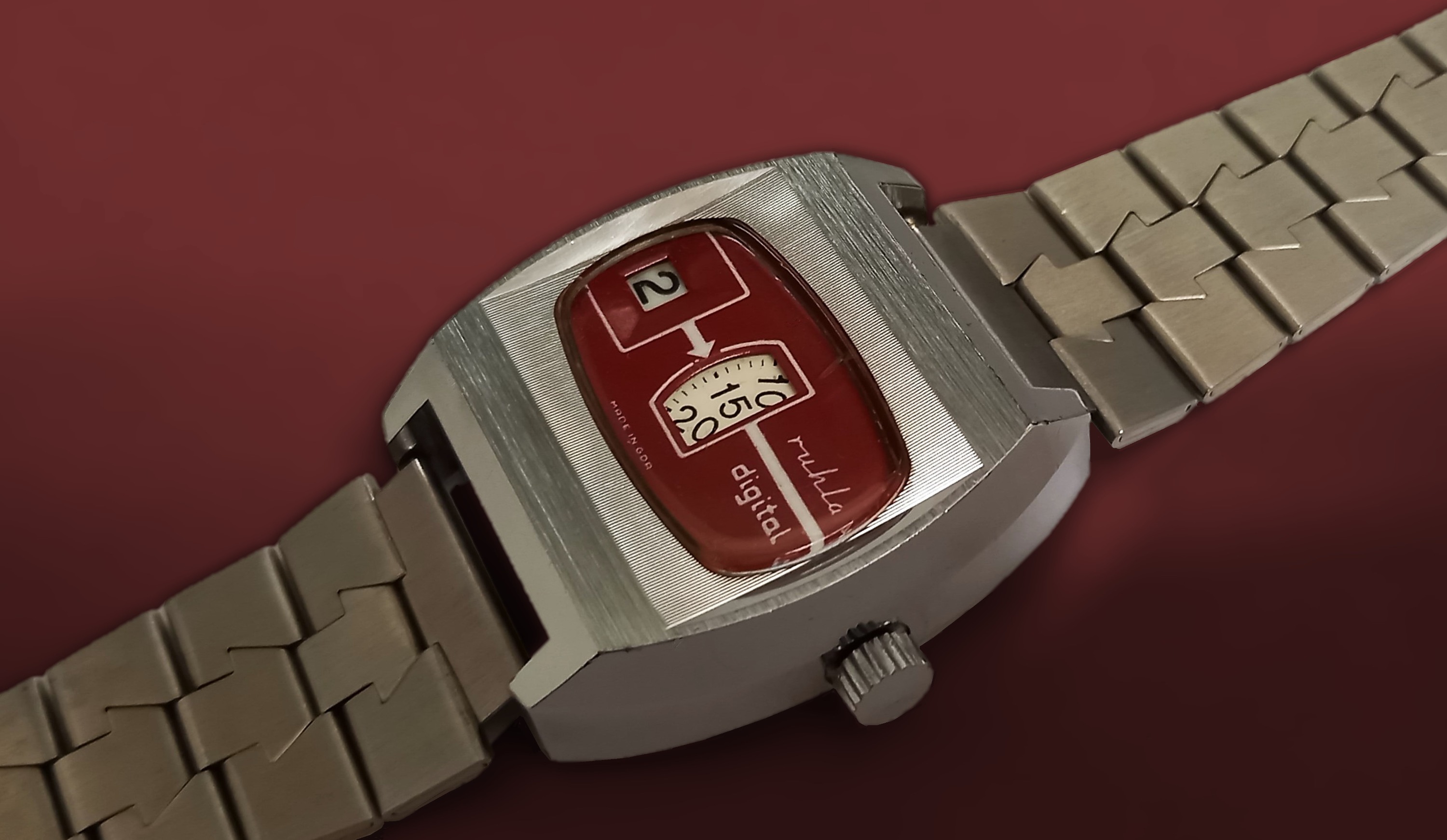 Heute meine rote Ruhla Digital im TV-Gehäuse mit dem UMF 24-34 von 1976 und einem Band von Aseikon, einer Marke aus Hongkong, die oft UMF-Werke verwendete. Es gab auch eine ganz ähnliche digitale Aseikon, die eben dieses Band hatte und man findet es manchmal bei Ruhla-Uhren. So ist dieses Band also "fast" original, wenn auch die Ruhla Digital wohl immer am Gummiband verkauft wurden.
