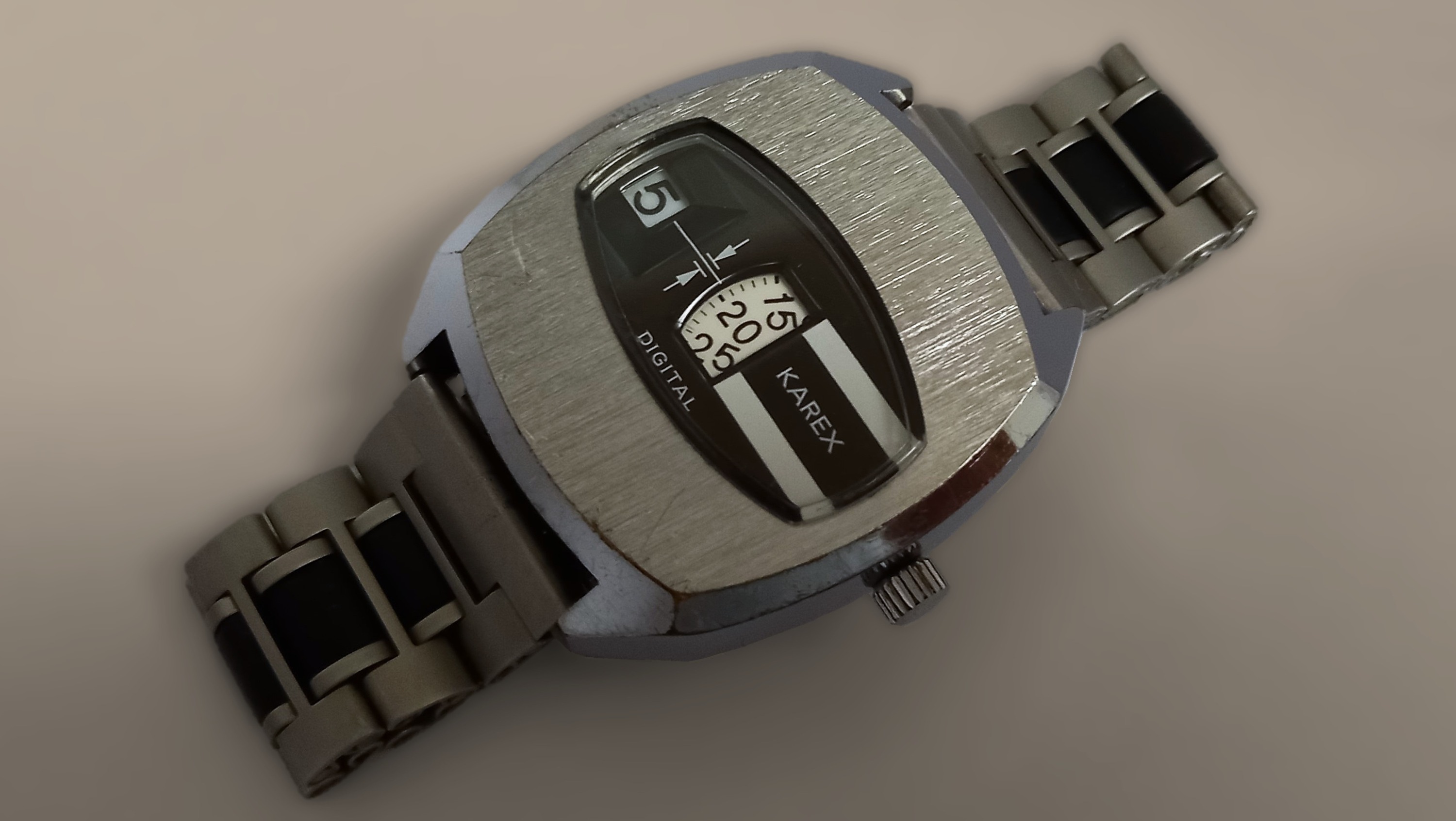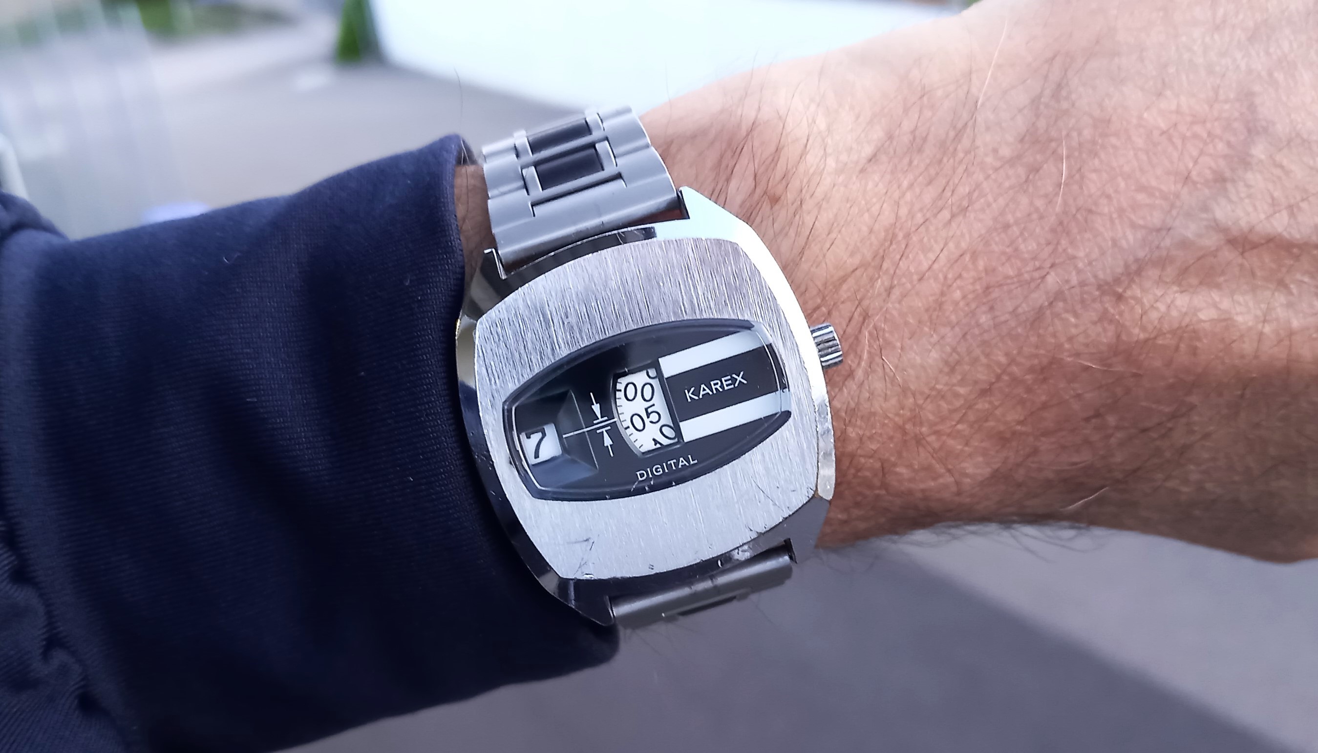 Und weiter mit den Ruhla-Festspielen, heute an meinem Arm ein Exportmodell, eine Karex von 1974, auch mit dem UMF 24-34 aus Ruhla. Karex war eine Marke des westdeutschen Uhrenhändlers Karl Rexer, die Werke der Karex-Digital-Uhren und wohl auch die Zifferblätter (zumindest die Rohlinge) kamen aus der DDR, die Gehäuse stammten aus anderer Quelle.