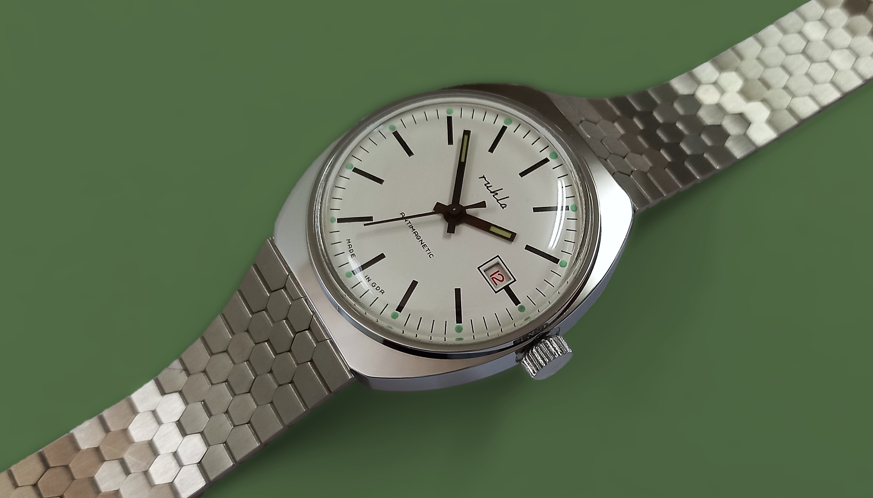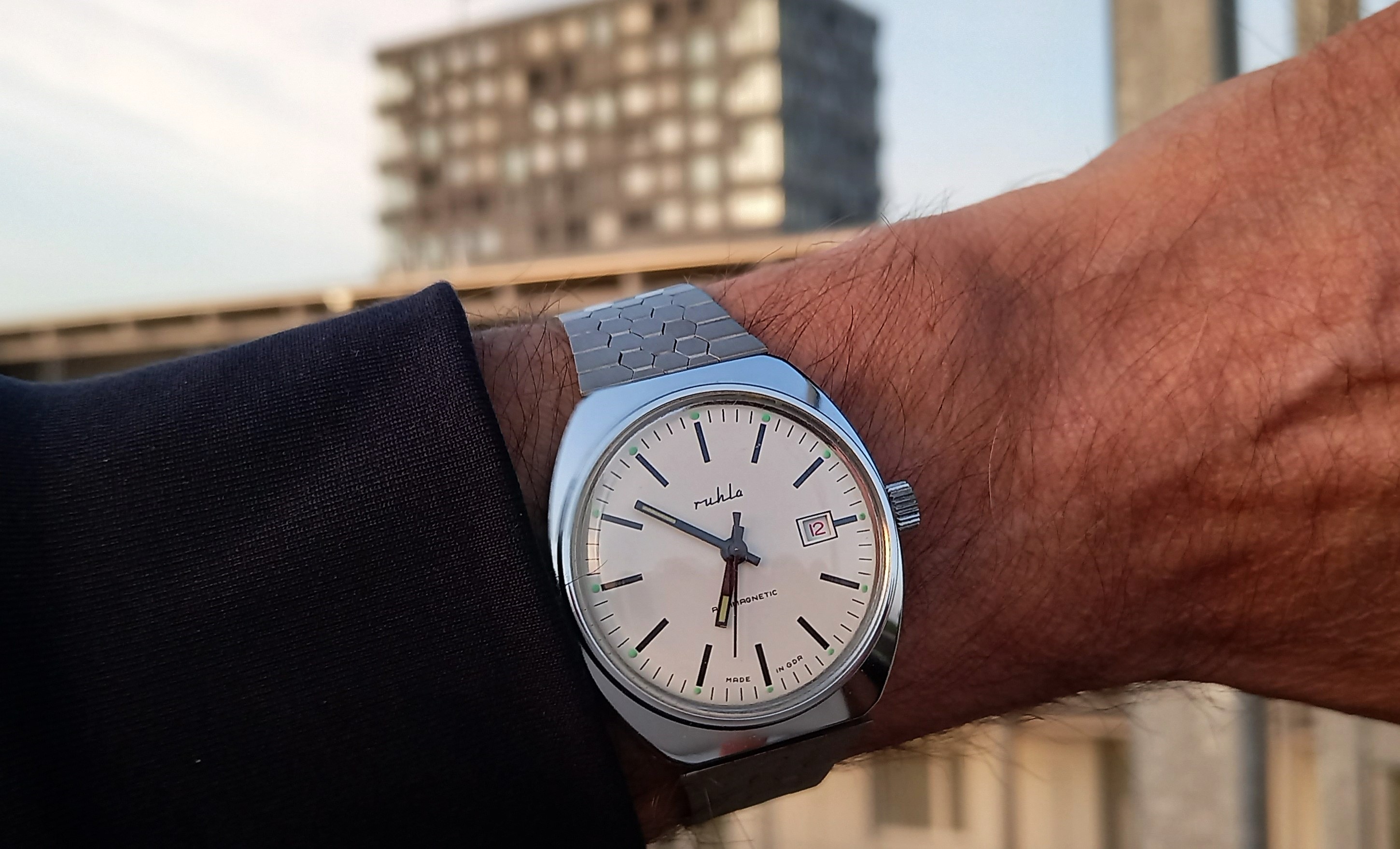Heute geht meine Ruhla-Parade weiter. Die 'Ruhla Antimagnetic' mit dem weissen Zifferblatt stammt aus den '80er Jahren. Normalerweise kann man die UMF 24-Werke datieren mit Hilfe eines Produktionsstempels unter der Unruh. Bei dieser Uhr lautet er aber '0445', was nicht zu deuten ist. Dieses glänzend verchromte Gehäuse findet man häufig bei verschiedenen Ruhla-Uhren dieser Zeit. Man kann das Werk nicht nach hinten aus dem Gehäuse entnehmen, sondern muss das Plexiglas dazu abheben. Das einfache Stiftankerwerk UMF 24 wurde mit verschiedenen Komplikationen ausgestattet, die jeweils eine eigene Kalibernummer bekamen, wodurch eine ganze Werkfamilie entstand. In dieser Uhr ist es das UMF 24-33 mit indirekter Zentralsekunde (angetrieben durch das Kleinbodenrad) und mit Datum. Bei der Datumsschaltung des UMF 24 kann nicht durch Vor- und Zurückdrehen über die Zwölf das Datum halbschnell weitergeschaltet werden, denn das Datum schaltet sowohl vorwärts, als auch zurück beim Stellen. Deshalb muss man also bei diesem Werk tatsächlich durchkurbeln, kann das aber vorwärts oder zurück tun, je nachdem, wie es kürzer ist.