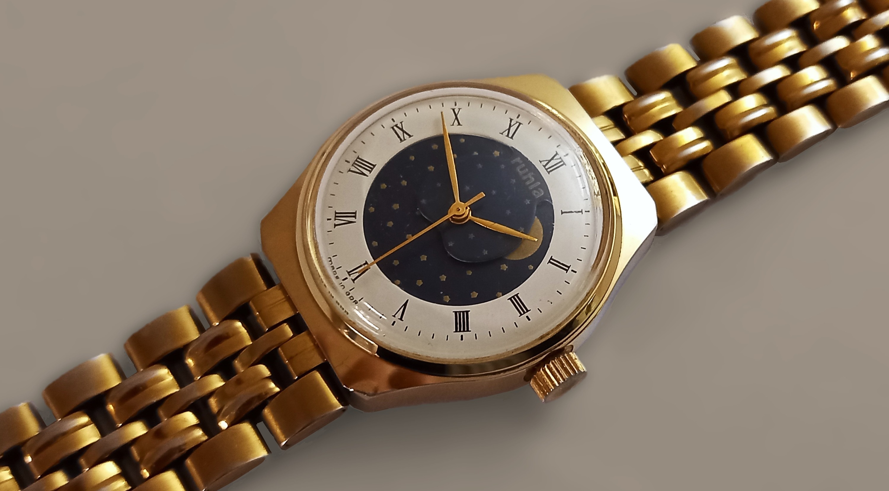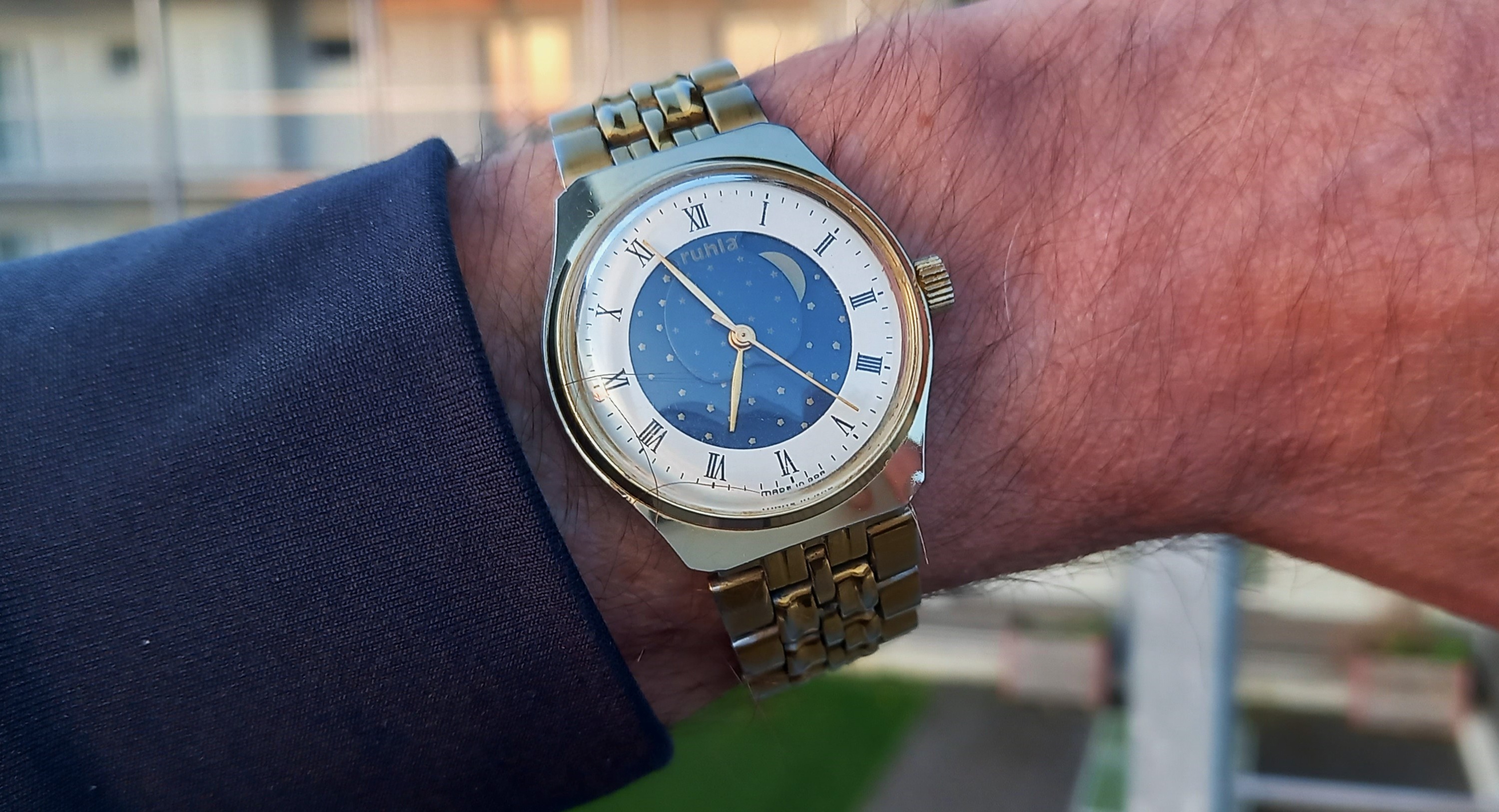 Heute trage ich die Ruhla-Mondphasenuhr (es gab sie in Gold- oder Silberfarbe als Armbanduhr oder als Taschenuhr). Die Mondphasenanzeige des UMF 24 entstand durch eine Modifikation der Datumsanzeige (Mondphasenscheibe mit 30 Zähnen statt 31 Zähnen bei der Datumsscheibe) und kann wie diese beim Stellen vorwärts oder rückwärts geschaltet werden.