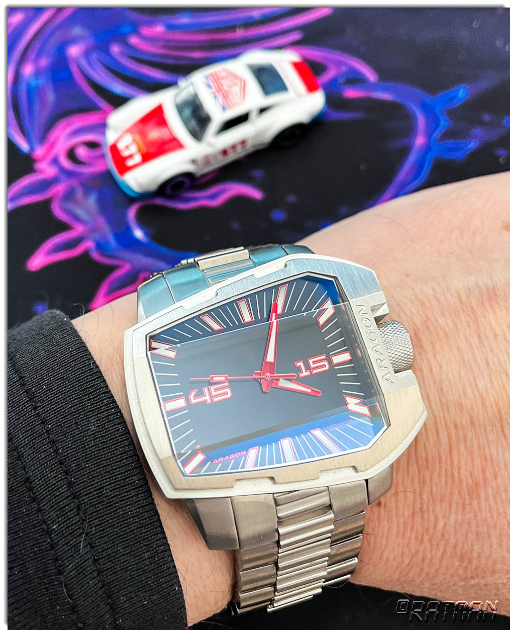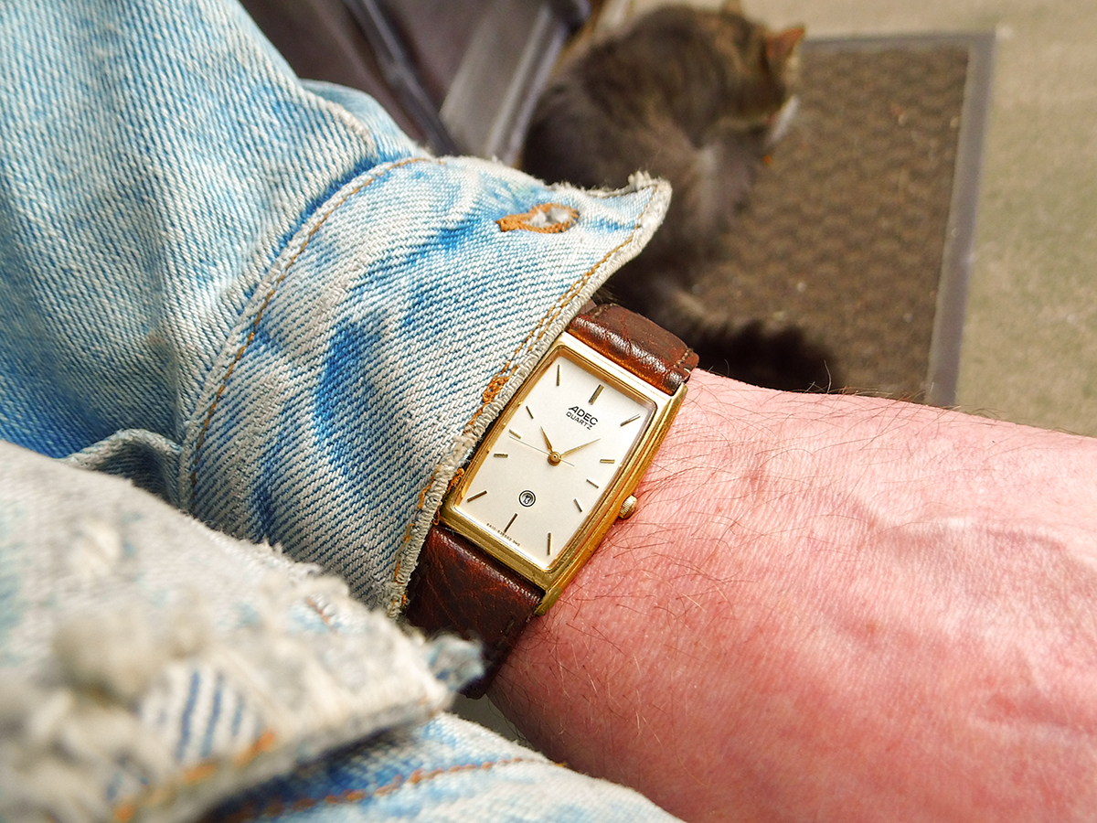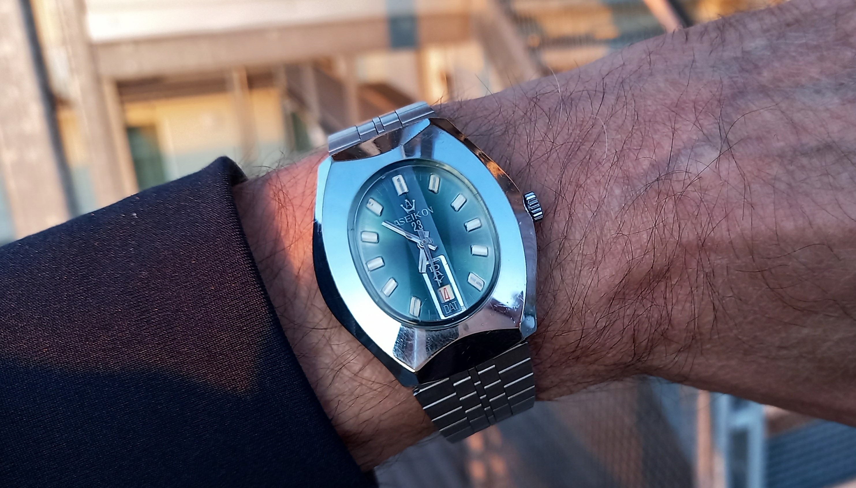 Heute bin ich spät dran. Die Bilder sind von heute morgen. Das ist meine 'Aseikon 23' von 1976. Die Marke mit Bling-Bling-Billiguhren stammt aus Hongkong, Besitzer waren aber wohl zwei Geschäftsleute aus Israel. Es wurden oft UMF 24-Werke verwendet, wie auch bei meiner Uhr (UMF 24-33) und ich vermute, dass auch die Zifferblätter aus Ruhla kamen. Die Gehäuse stammten wohl aus anderer Quelle. Das Markensymbol, die "A-Krone", findet man nur bei Uhren mit UMF 24. Die Werke sind meist gepunzt mit "Tradear Ltd Hongkong". Diese Uhr ist schon ein wenig bizarr geformt, das Plexiglas ist auf der Innenseite facettiert. Es gab auch ein Modell von 'Ruhla' mit dem gleichen Gehäuse und fast gleichem Zifferblatt. Solche hochglänzenden Gehäuse sind nicht leicht zu fotografieren, das Bild mit der Uhr am Arm ist noch das beste von ca. zwanzig, aber richtig gut ist es leider nicht...