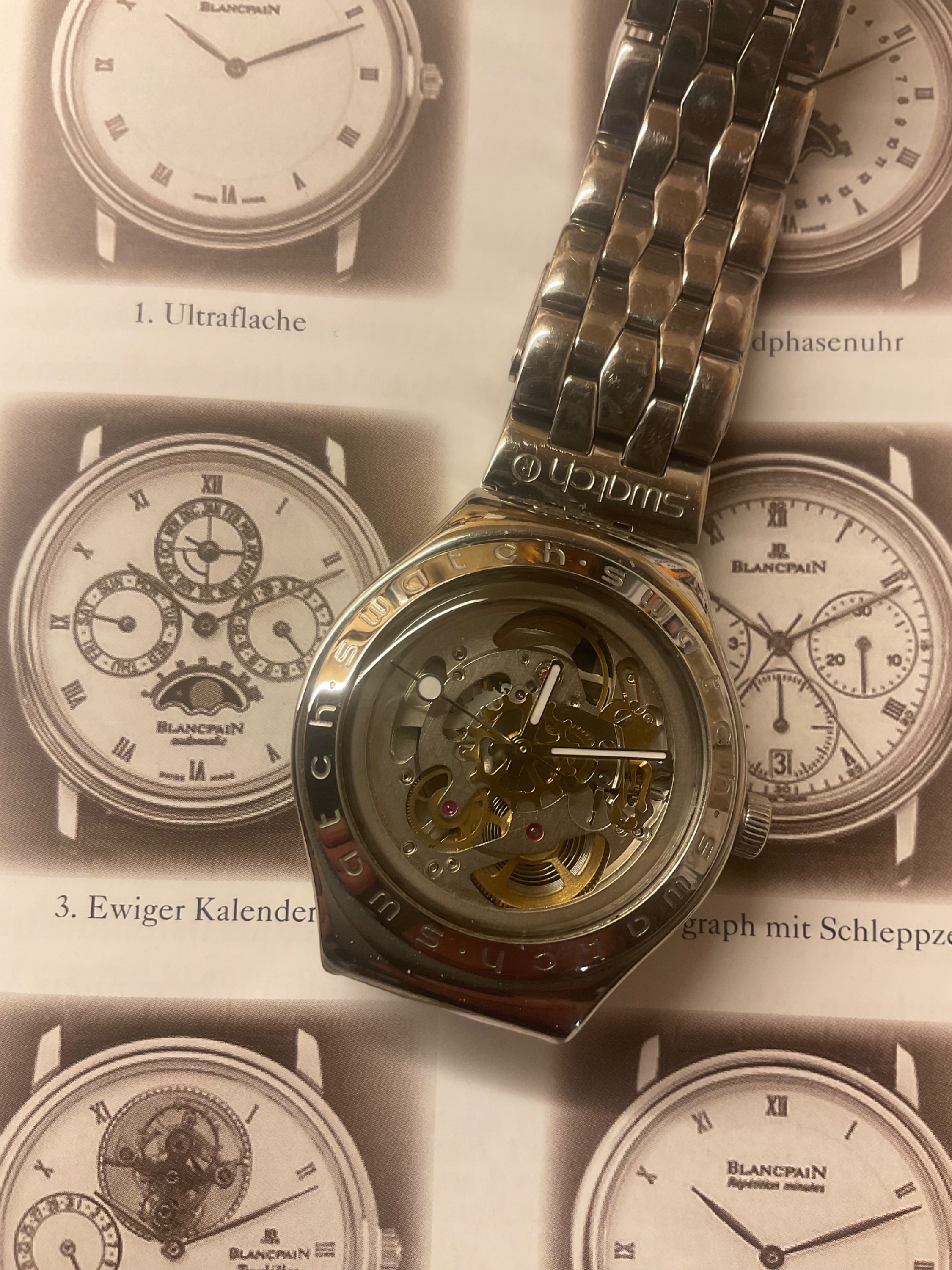 Bevor ich zu den gezeigten Uhren vom Andi 2 komme, eine Swatch Uhr, die hier schon mehrmals gezeigt wurde, die auch als „Wegwerfuhr“ klassifiziert wurde, die „Body & Soul“ genannt. Aber zuerst die Abbildung der Uhr, im Hintergrund verschiedene Modelle aus den Büchlein Blancpain, „die Ethik von Blancpain“ (1981), eine Zeit die auch meine Hoooochzeit für das Interesse von AU waren.