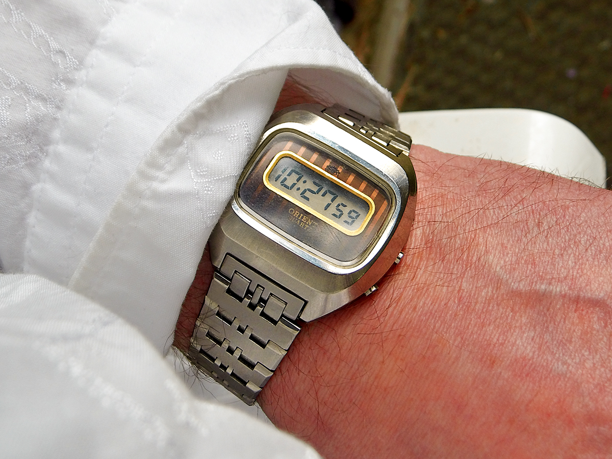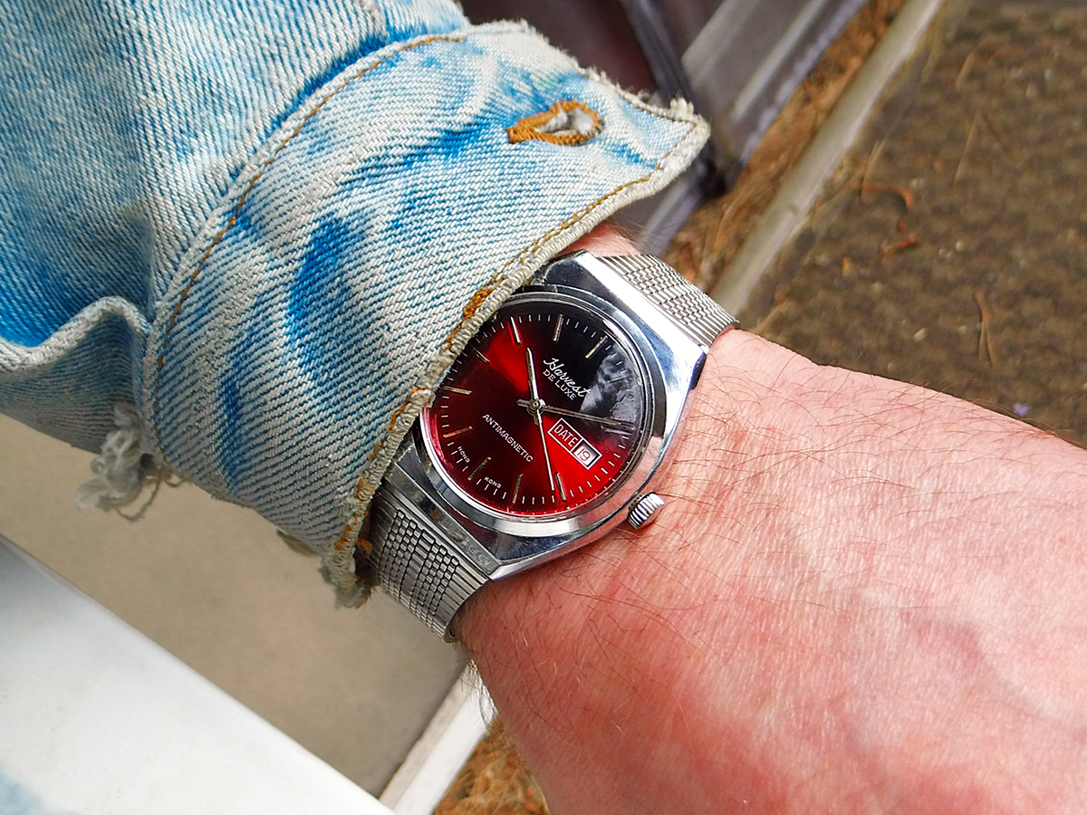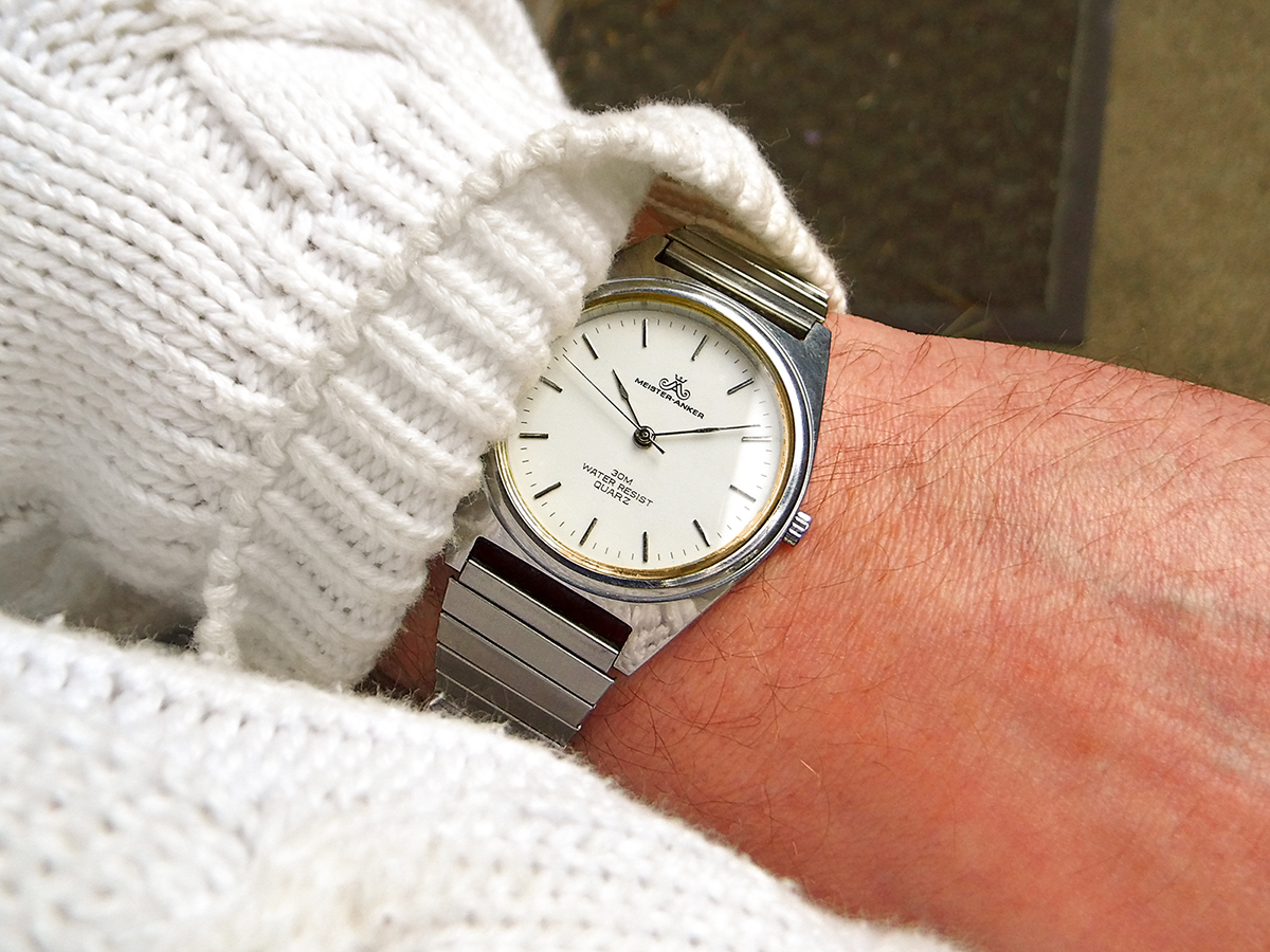 Das Armband hab ich vom Flohmarkt, NOS. Dort konnte ich schon einige gute Bänder finden, meist für sehr überschaubare Kosten. Es dürfte wohl 5 Franken gekostet haben. Es passt an die Uhr wie dafür entworfen. Die Uhr hat wohl ca. 35 mm quer ohne Krone (kann das im Moment nicht nachmessen, hols aber morgen nach...).