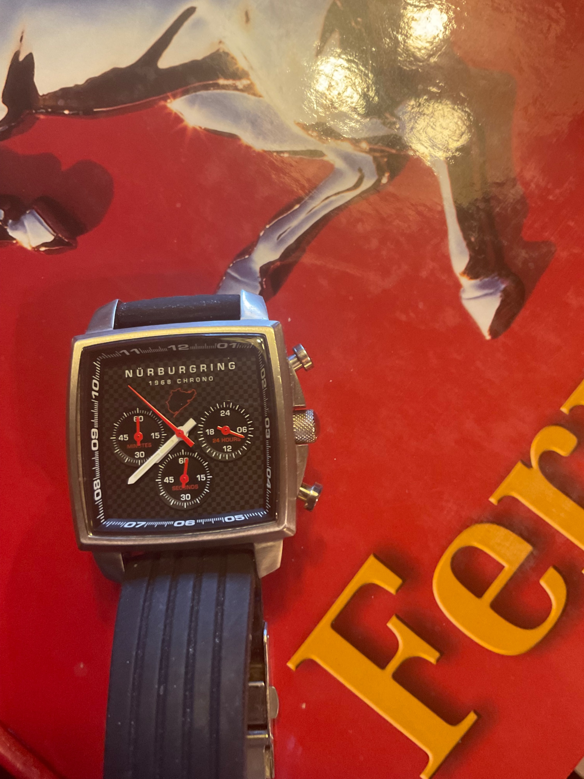 21 Apr. 2024 07:59 - 21 Apr. 2024 08:00Meine „Nürburgring“ Uhr, die an das „klassische Regenrennen 1968“ erinnert, da einer der beteiligten Rennfahrer vom Flugzeug runterschauend sagte:Das ist ja die „grüne Hölle“. Seitdem hat sich dieser Begriff bei schlechten Wetter etabliert. Und das ist am Nürburgring öfter als gedacht, der Fall!