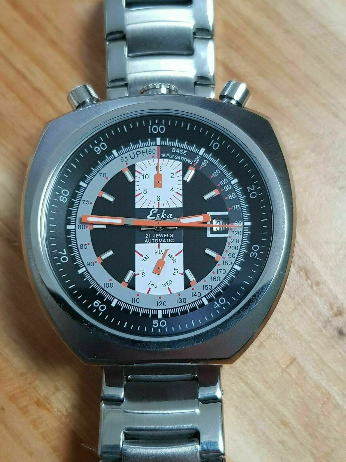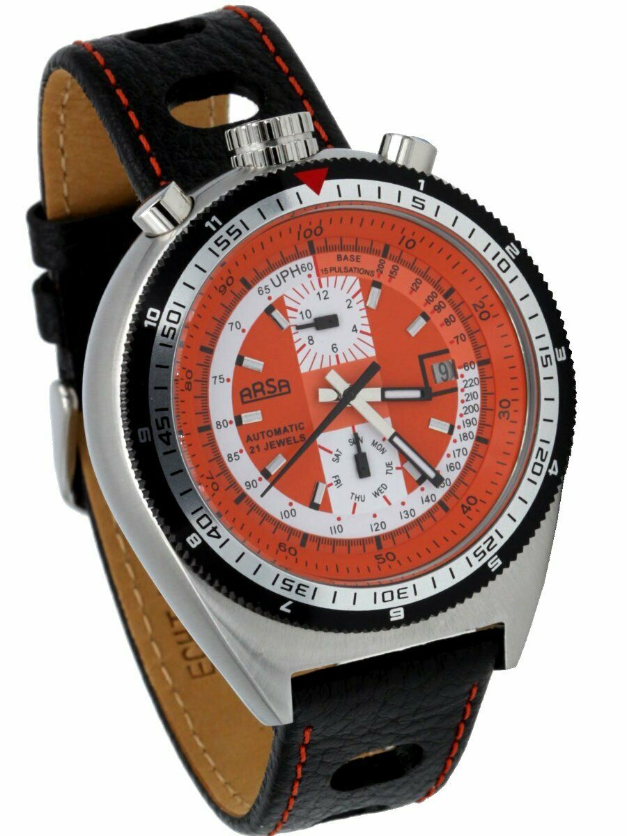 Bei Ebay bin ich über einen Haufen Uhren gestolpert, die sich auffallend ähneln. Unter den Bezeichnungen ARSA, ESKA und SORNA tummeln sich dort diverse Uhren im Bullhead-Design, die mir einerseits schon gut gefallen, die aber andererseits Irritationen hervorrufen. Denn nirgends ist eine Info zu finden, ob diese Dinger eine Tachymeter- bzw. Chrono-Funktion haben, obwohl sich ja zwei Drücker oben am Case finden, welche für das typische Bullhead-Aussehen verantwortlich sind.