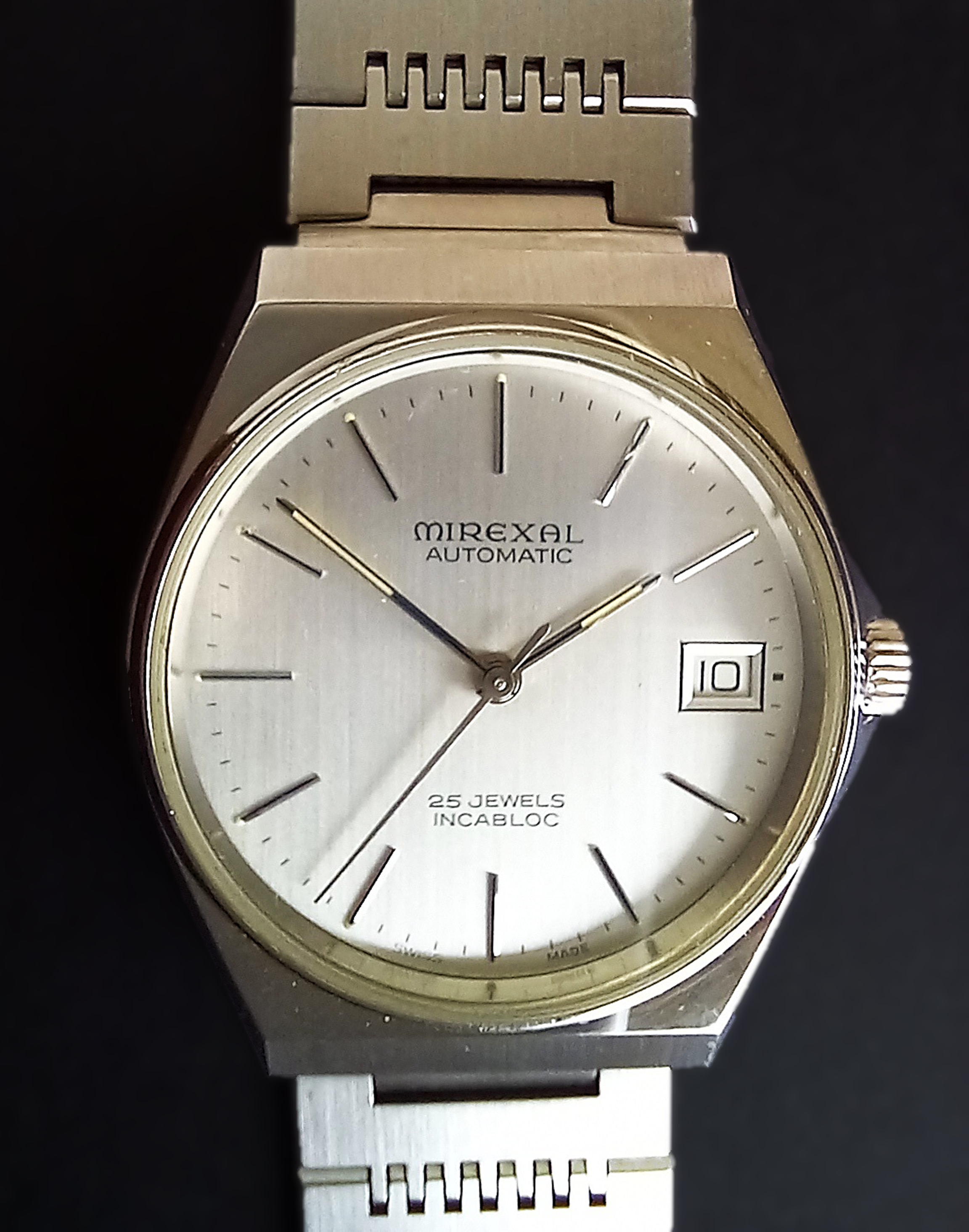 Hier mal meine 'Mirexal', das ist sicher nur im entferntesten Sinne Genta und in der zahmsten Form. 'Mirexal' war eine Kaufhausmarke der Schweizer Supermarktkette Migros, die es von 1969 bis 1982 gab und die dann von der gesichtslosen Eigenmarke 'M-Watch' abgelöst wurde, diese Uhren wurden von Mondaine hergestellt.