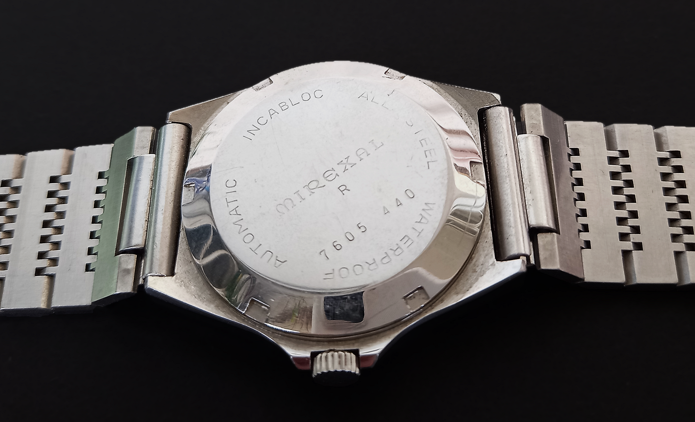 Meine Uhr mit der Modellnummer R 7605 440 stammt also von Rotary. Sie wird angetrieben durch ein ETA 2824-2 (Werk gepunzt unter der Unruh). Ich kann deshalb annehmen, dass die Uhr aus dem Jahr 1982 stammt, dem letzten Jahr, als die Marke 'Mirexal' existierte, laut dem Ranfft-Uhrwerkarchiv war 1982 auch das erste Produktionsjahr des ETA 2824-2.
