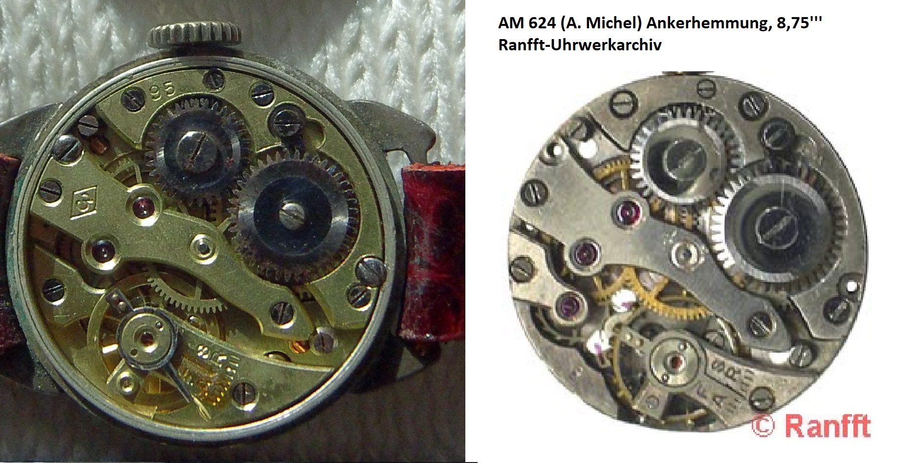 Im Uhrwerkarchiv von Christoph Lorenz findet man ein ähnliches aber doch verschiedenes AM-Cylinderwerk, das genau die gleichen Punzen auf dem Werk hat: 1.) das ZentRa-Zeichen, 2.) die Nummer 95 (mutmassliche interne ZenRa-Kalibernummer