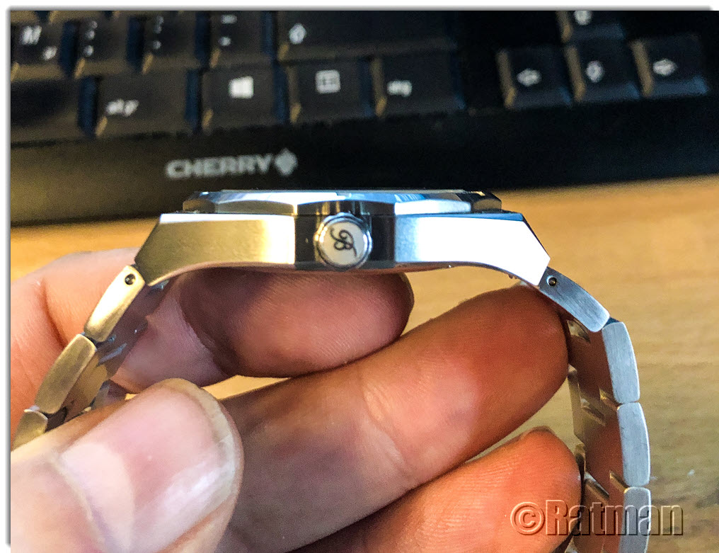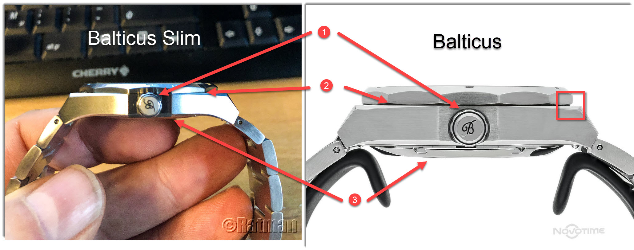 Man sieht schon anhand der Position der Krone (1), dass das Case der normalen Stardust (rechts) dicker ist als bei der Slim (links). Während bei der Slim die Krone über die obere Kante des Case ragt, ist das bei der Normalen nicht der Fall. Die Lünette (2) liegt bei der Slim vollständig plan auf dem Case auf. Bei der normalen Stardust sind die unteren Kanten nochmal hinterschliffen. Im Bild rechts auch nochmal in dem Rechteck hervorgehoben. Und schliesslich ragt der Boden (3) der ursprünglichen Stardust weiter aus dem Case heraus als bei der Slim. Ich vermute, dass das Werk der normalen Stardust (Miyota glaub ich) schlicht dicker ist als das schlanke Ronda der Slim.